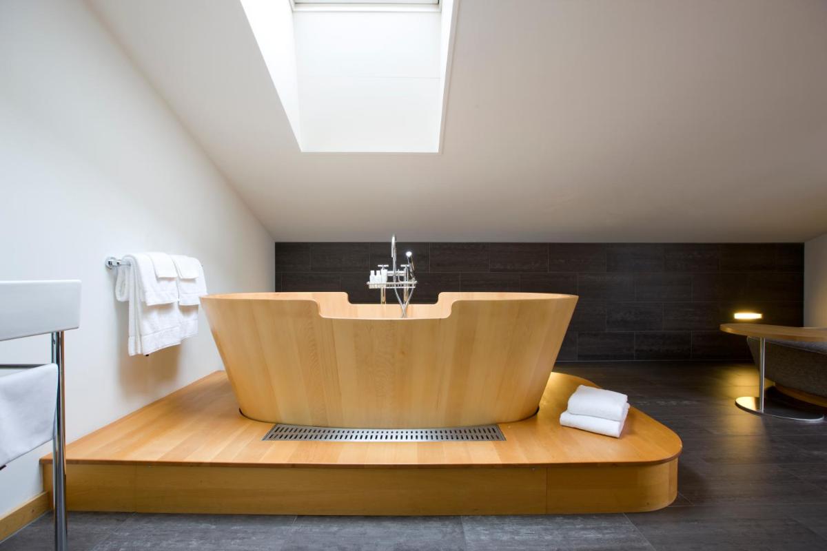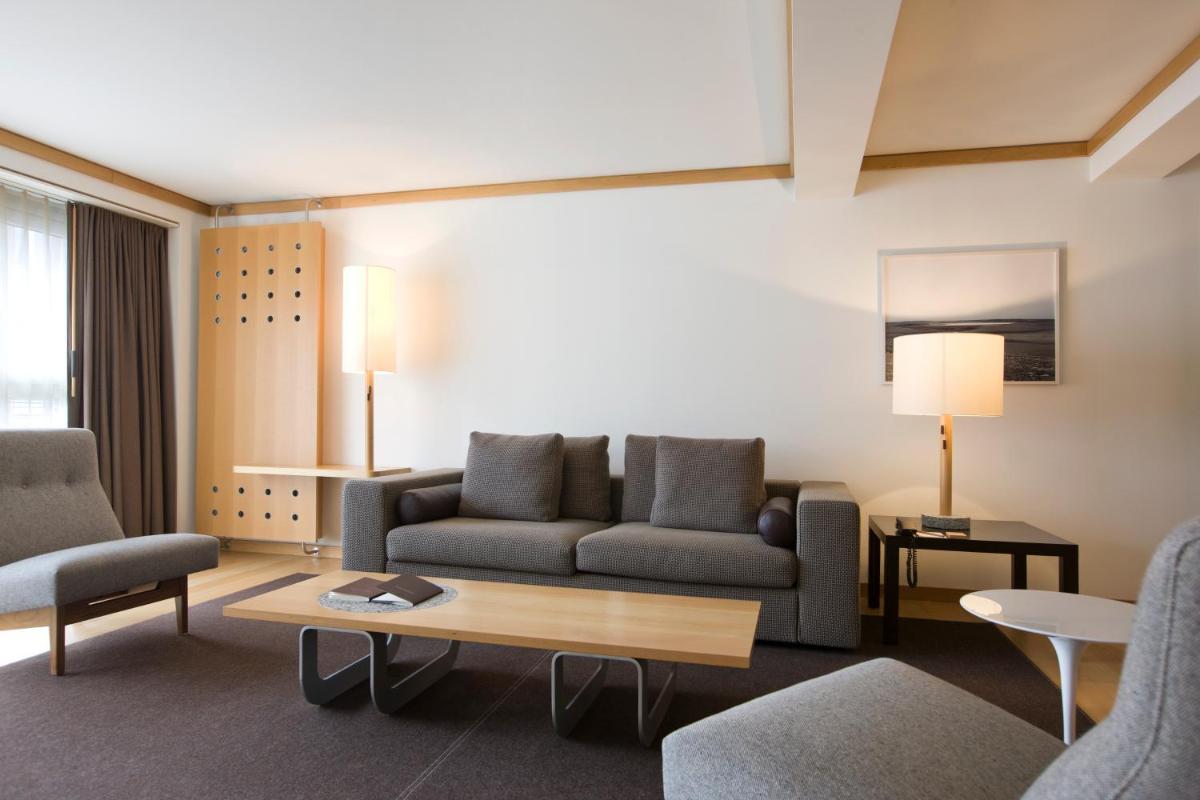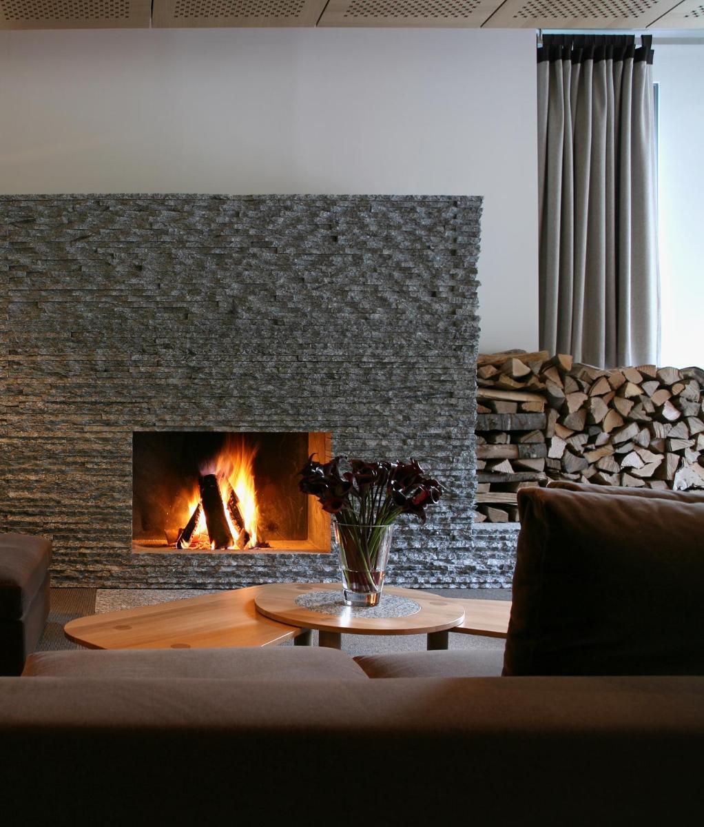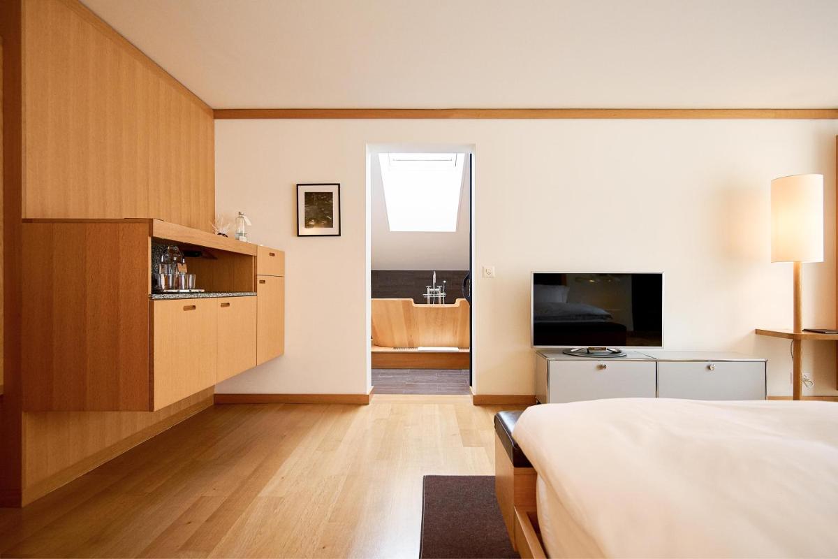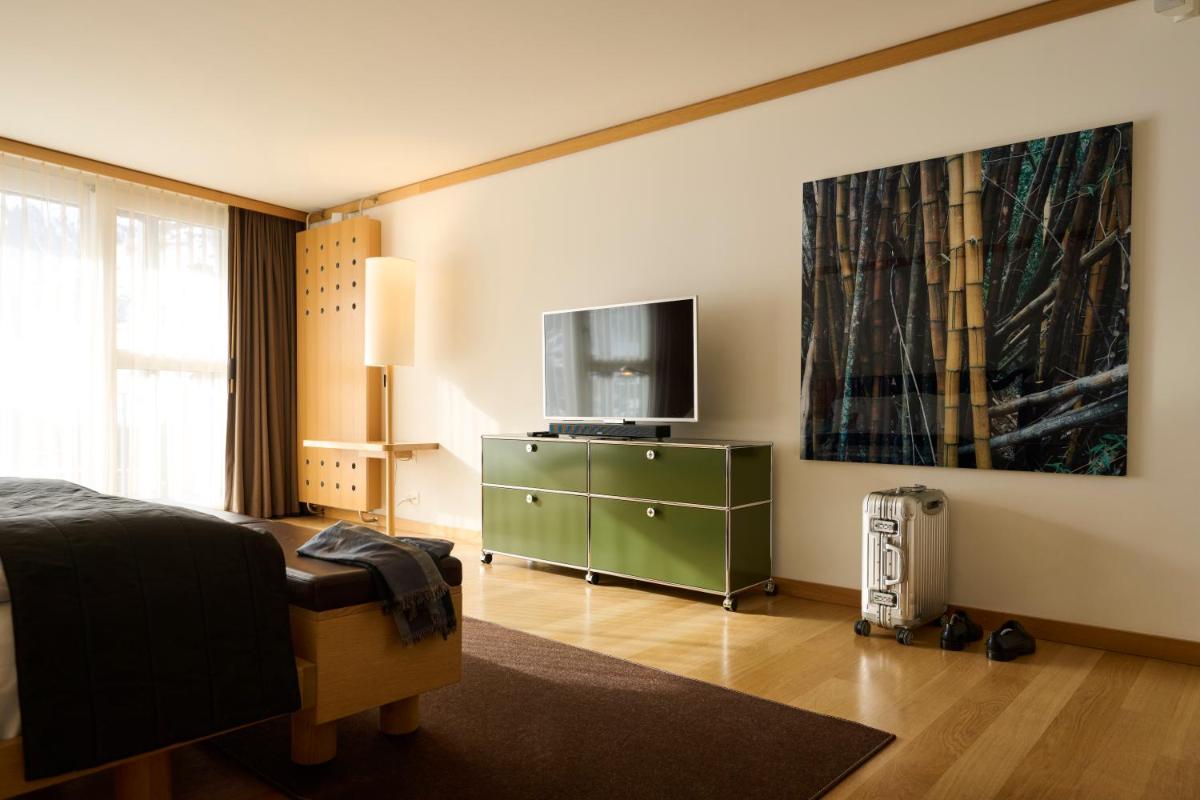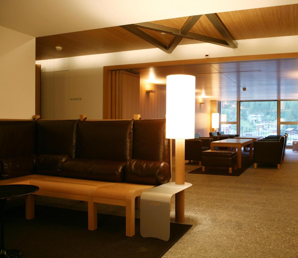 Il design interno è un capolavoro di minimalismo e comfort, caratterizzato dall'uso di materiali naturali come pietra, legno e vetro. Le 30 camere e suite sono concepite come eleganti rifugi, con ampie finestre e balconi che incorniciano il paesaggio alpino. Lo stile è ispirato al concetto di 'lodge' americano, ma con una sensibilità e una qualità artigianale svizzera.