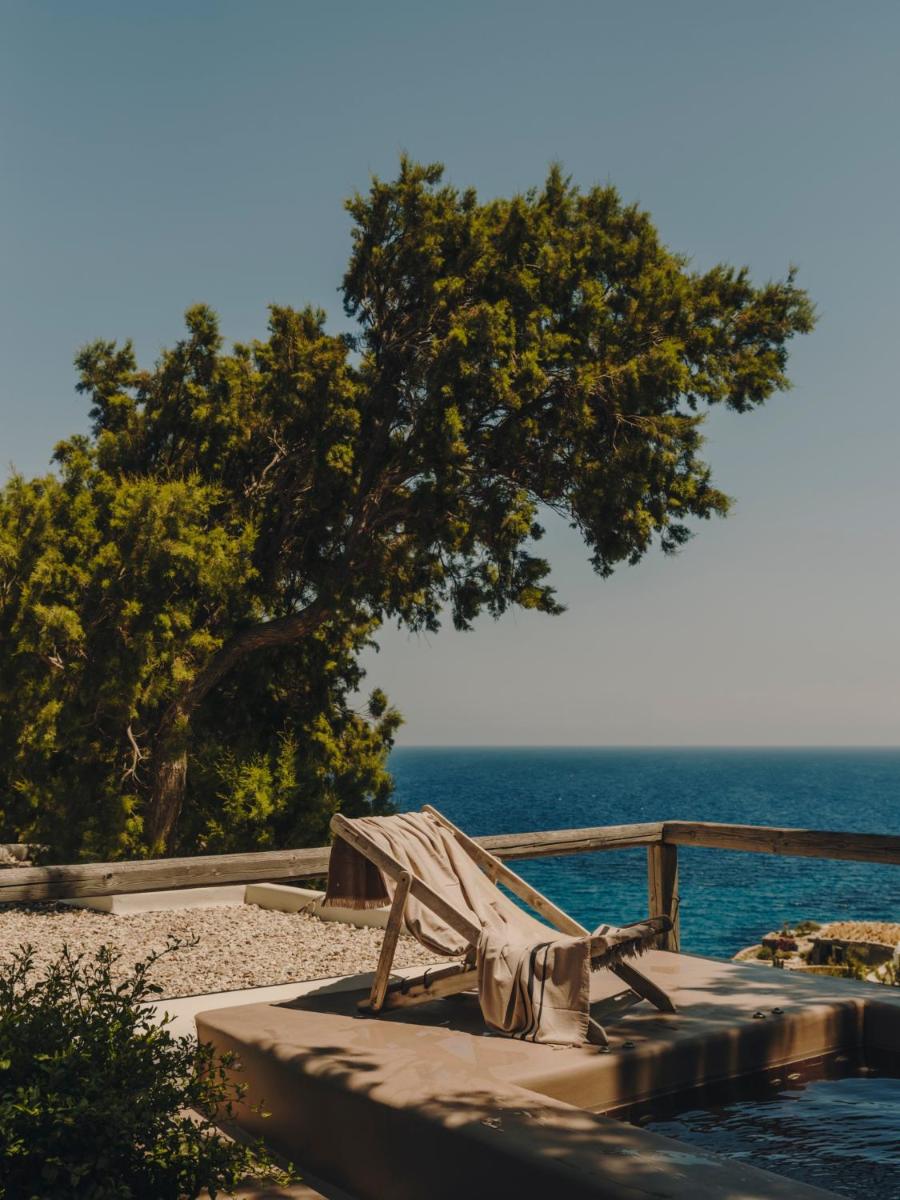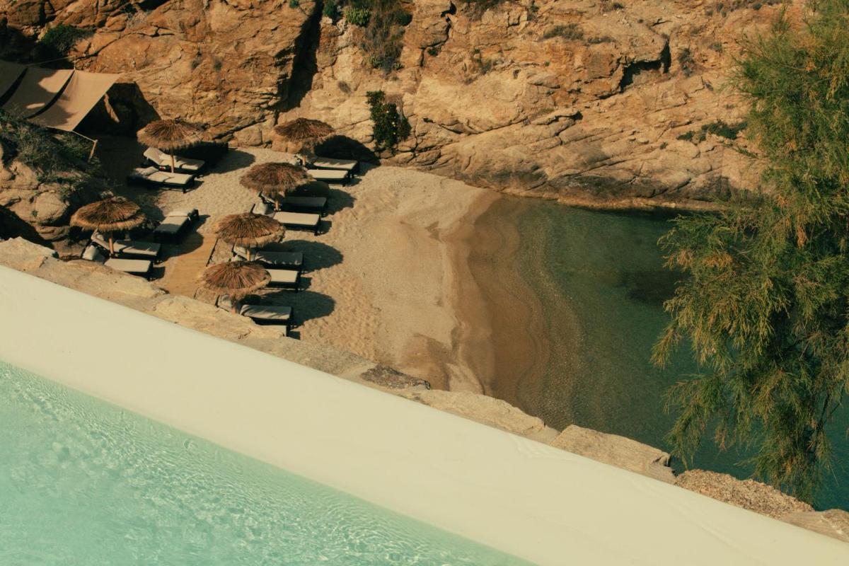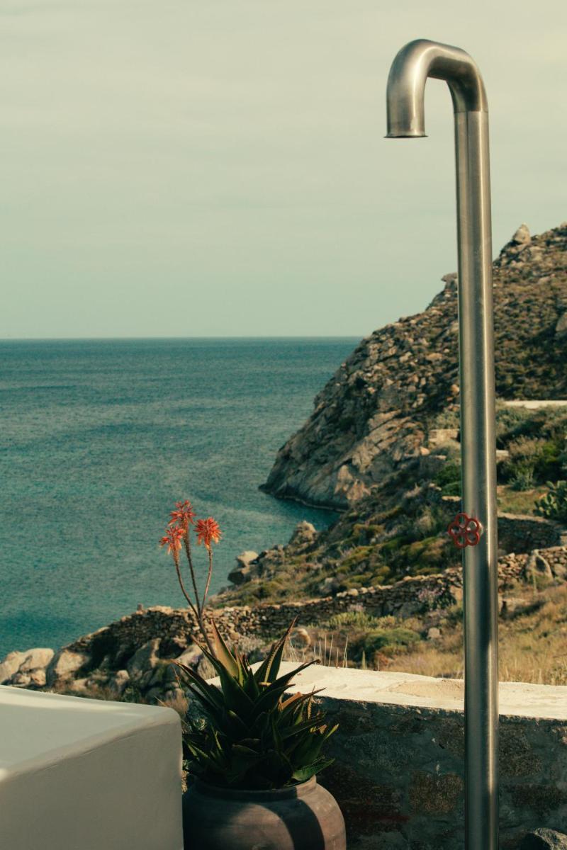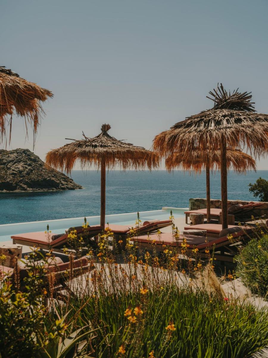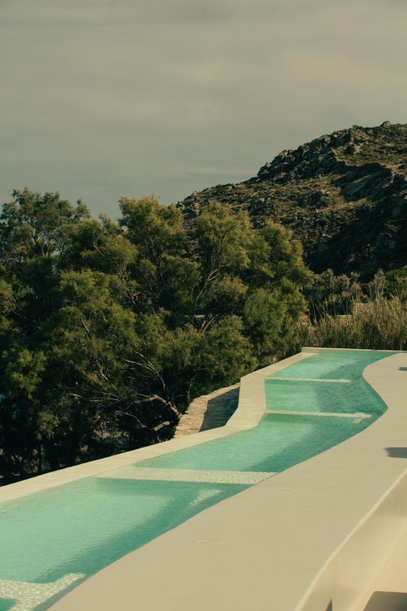 Il design è una celebrazione dell'estetica cicladica con un tocco moderno, caratterizzato da un uso abbondante di pietra a vista, legno naturale e tonalità neutre. Le sue 40 suite e ville sono ricavate in modo da integrarsi perfettamente con la scogliera, offrendo a tutte le sistemazioni una vista drammatica sul Mar Egeo e sulla spiaggia sottostante.