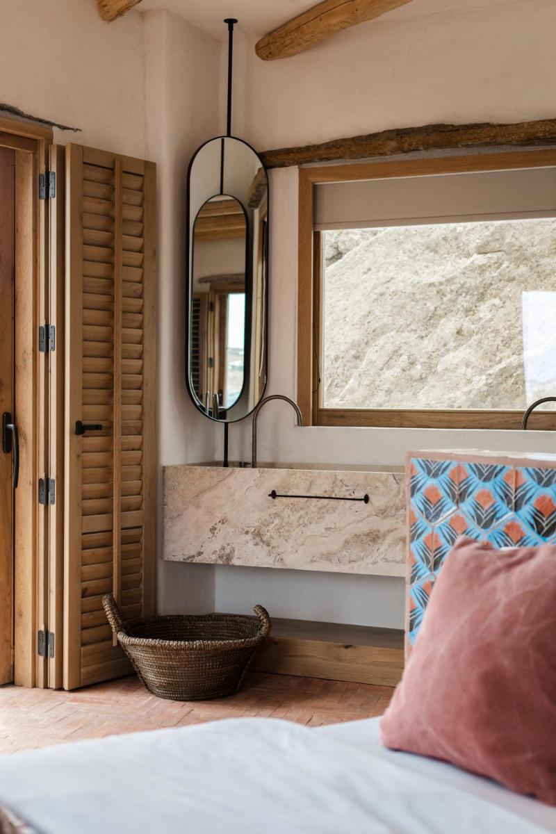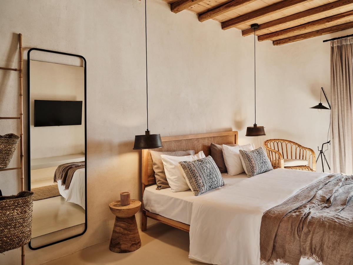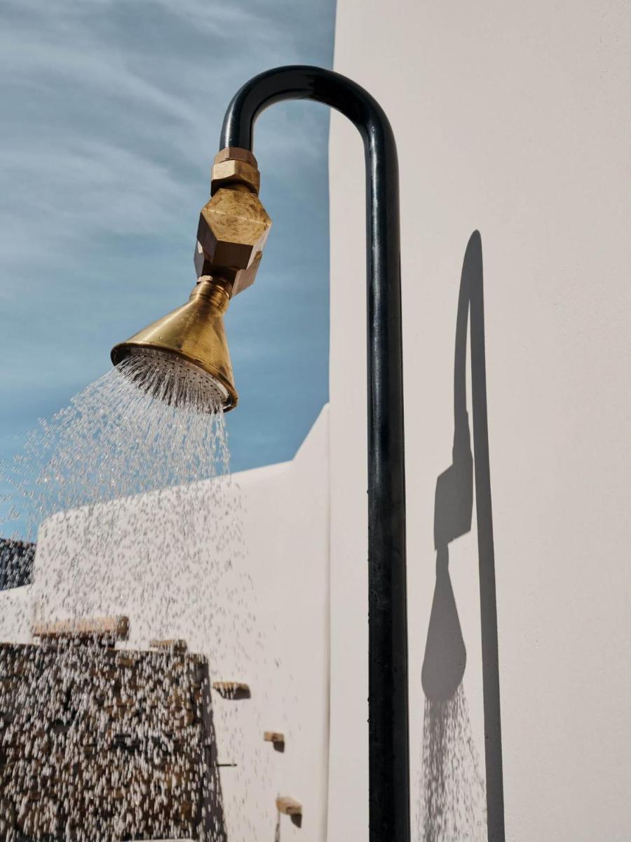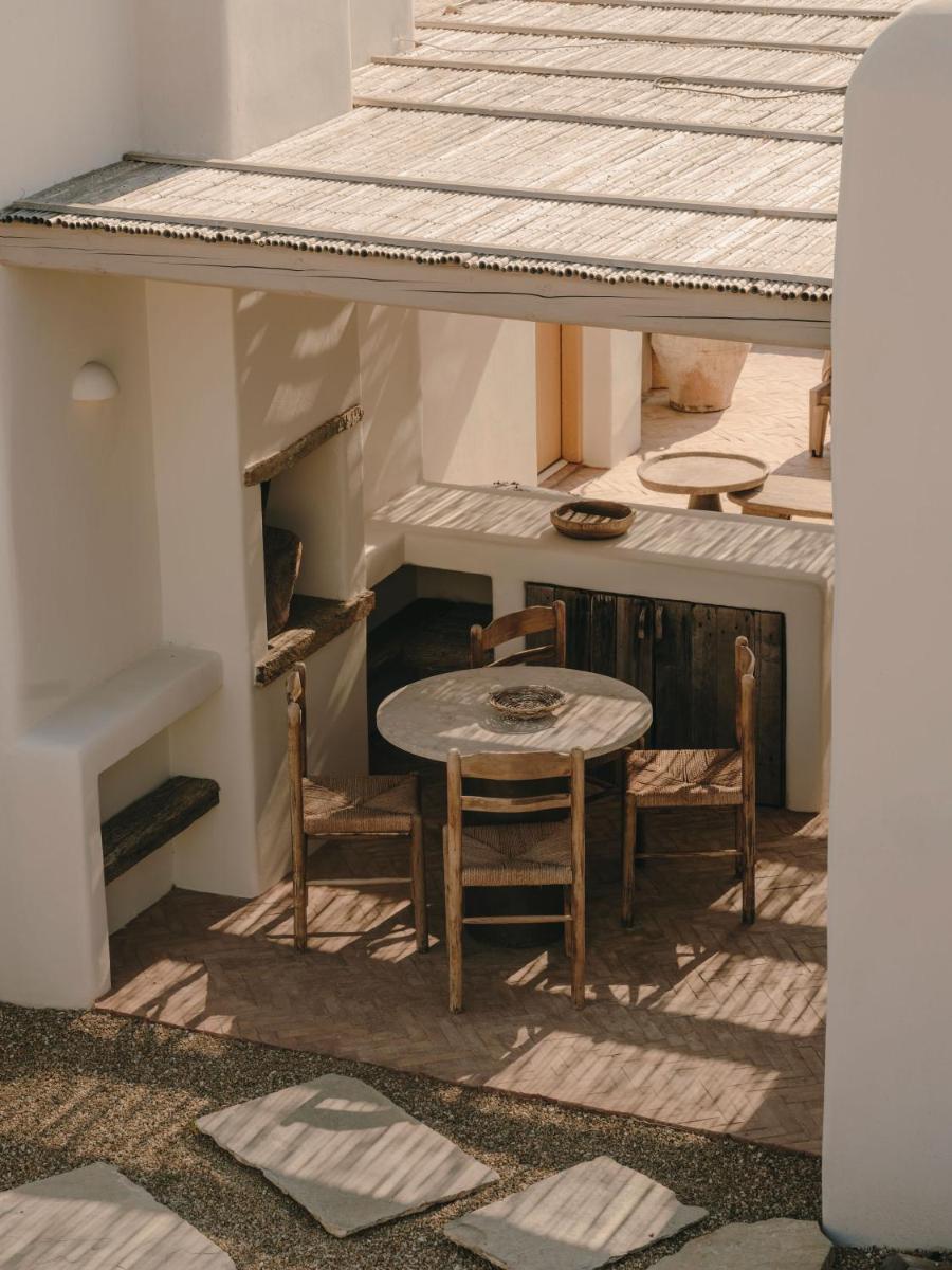 Il design è una celebrazione dell'estetica cicladica con un tocco moderno, caratterizzato da un uso abbondante di pietra a vista, legno naturale e tonalità neutre. Le sue 40 suite e ville sono ricavate in modo da integrarsi perfettamente con la scogliera, offrendo a tutte le sistemazioni una vista drammatica sul Mar Egeo e sulla spiaggia sottostante.