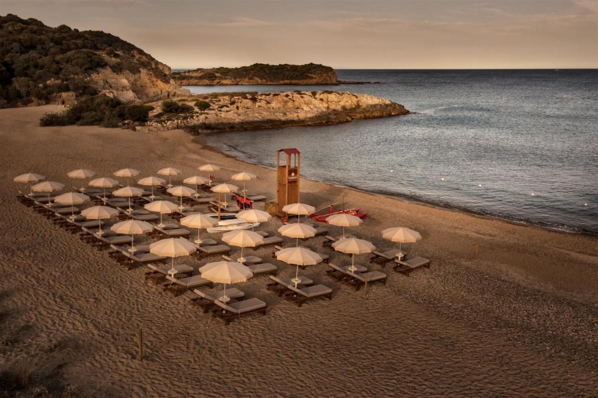 La piscina esterna a sfioro invita alla distensione con vista panoramica. Gli ospiti hanno accesso a una spiaggia privata attrezzata, ideale per momenti di puro relax.