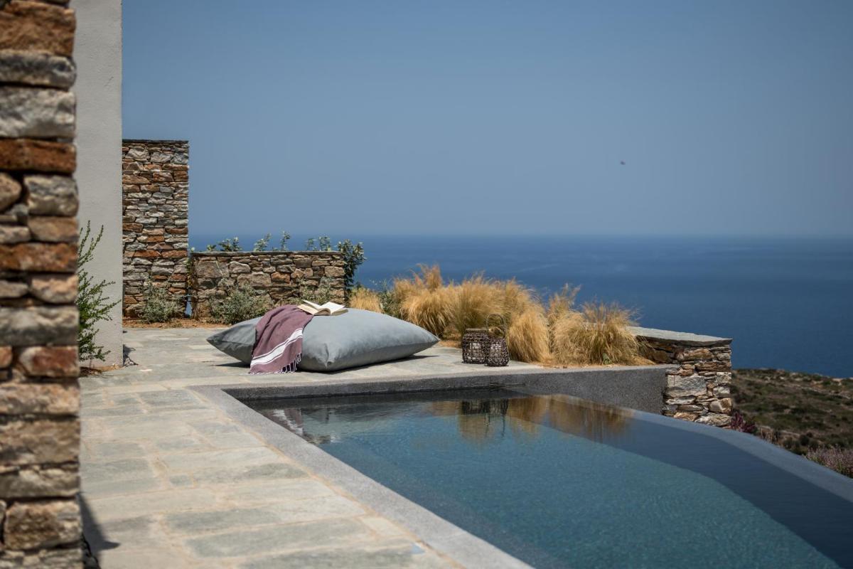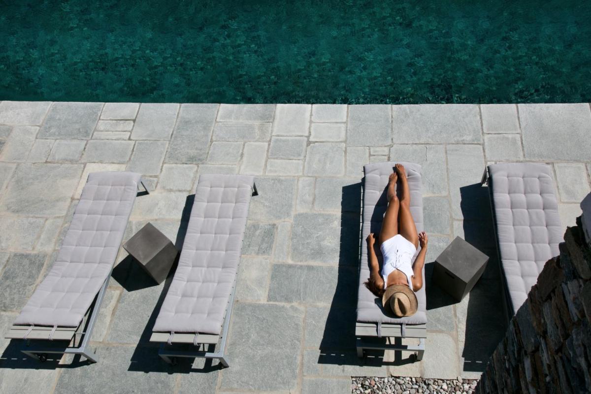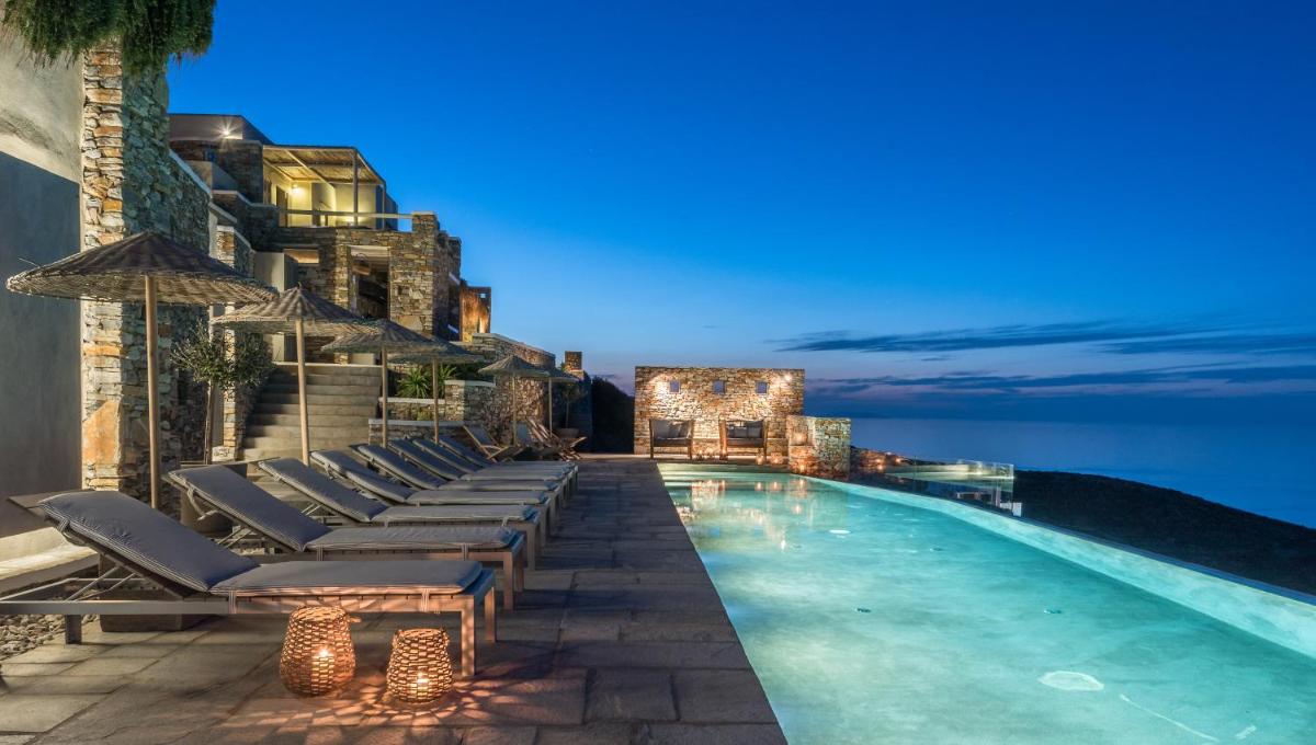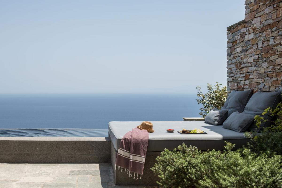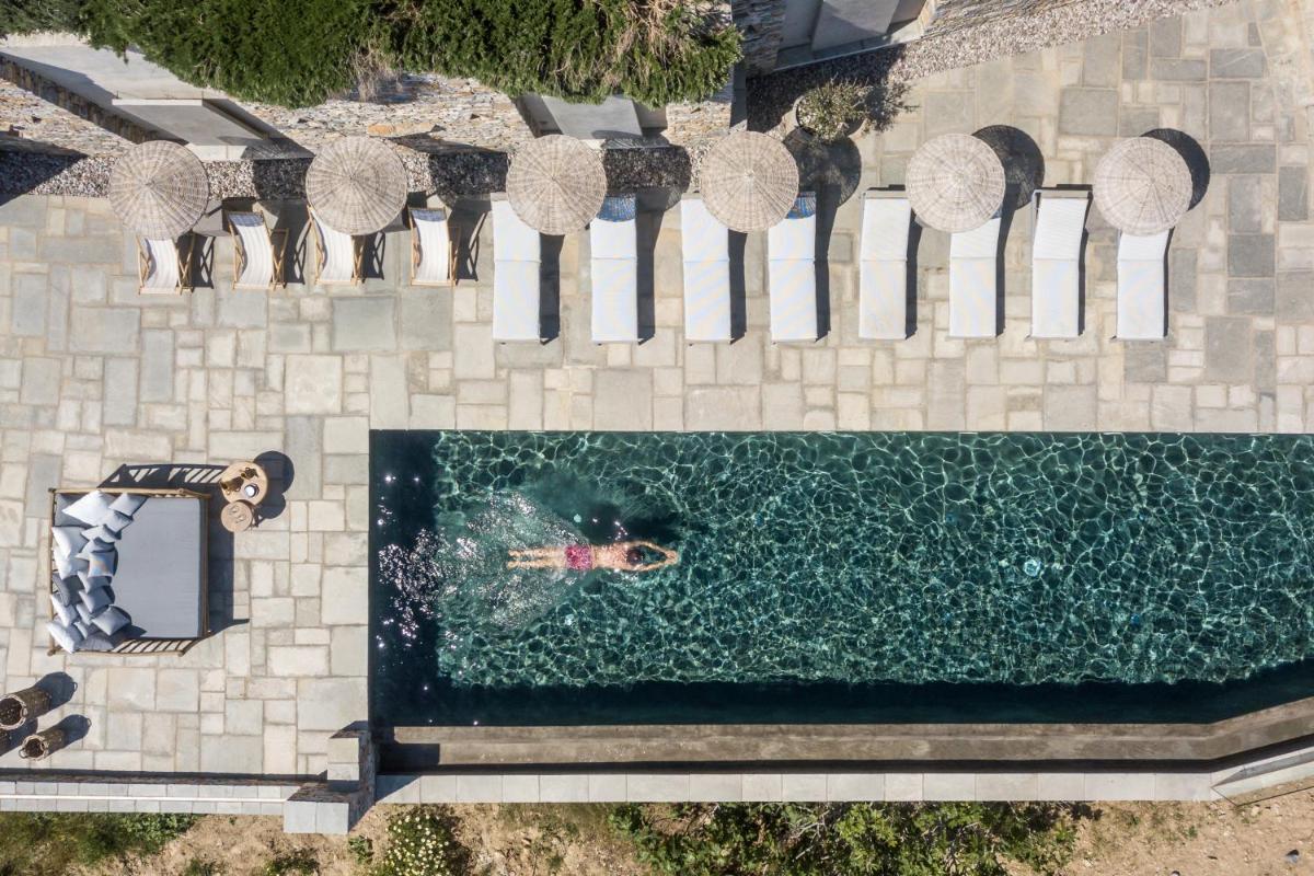 La piscina a sfioro è il punto focale della proprietà, strategicamente posizionata per dare l'illusione di fondersi con l'Egeo. Circondata da lettini confortevoli e ombrelloni, è il luogo ideale per trascorrere ore di relax ininterrotto. L'ambiente è curato per favorire la meditazione e il benessere lontano dal trambusto.
