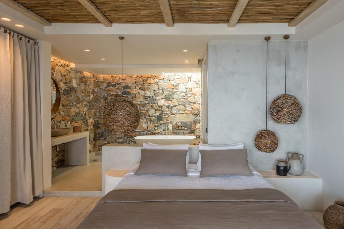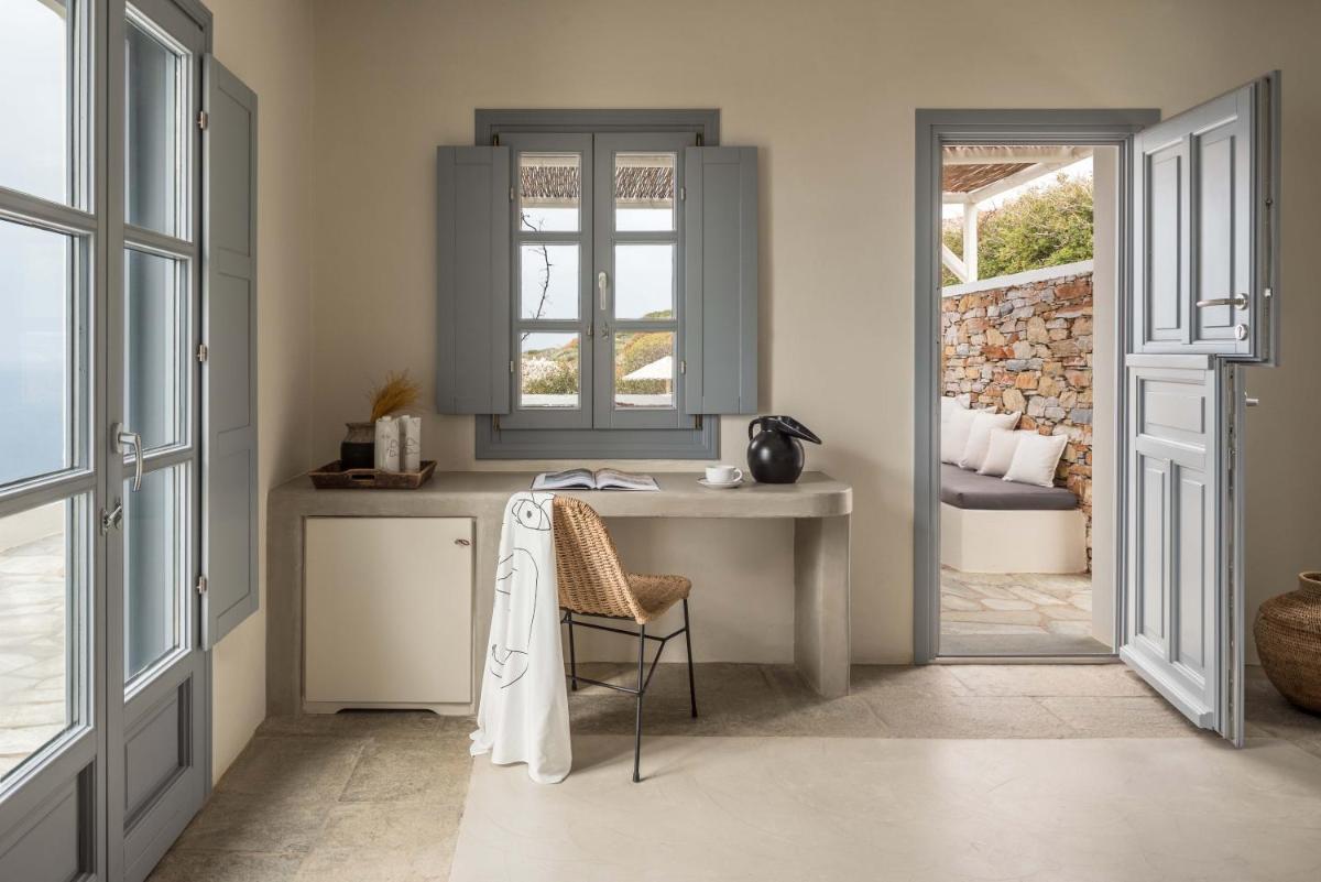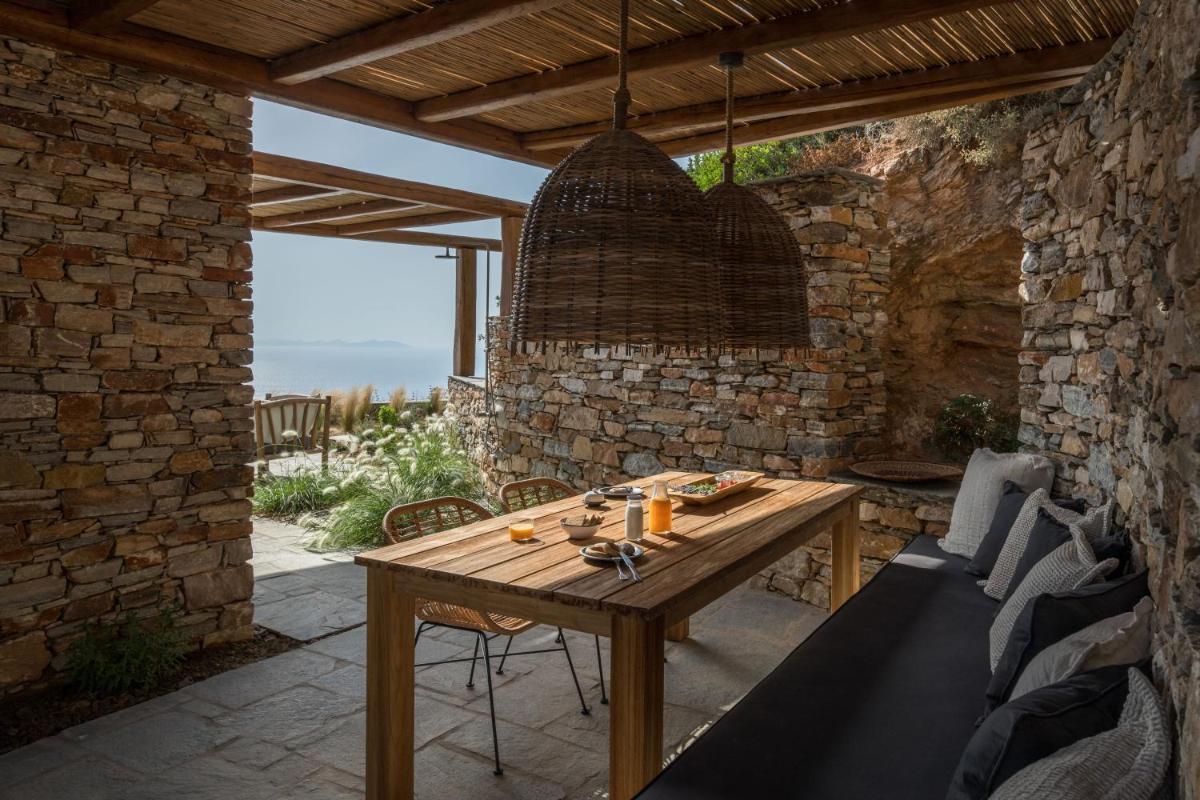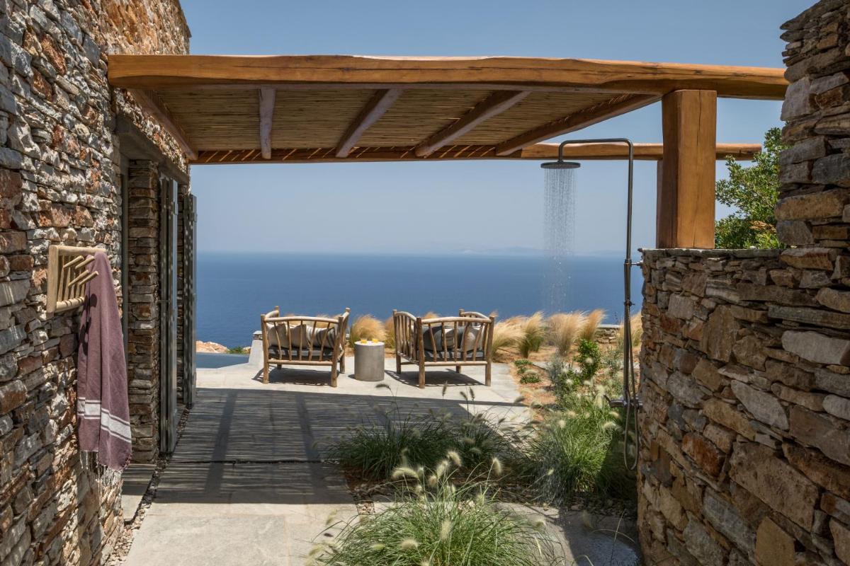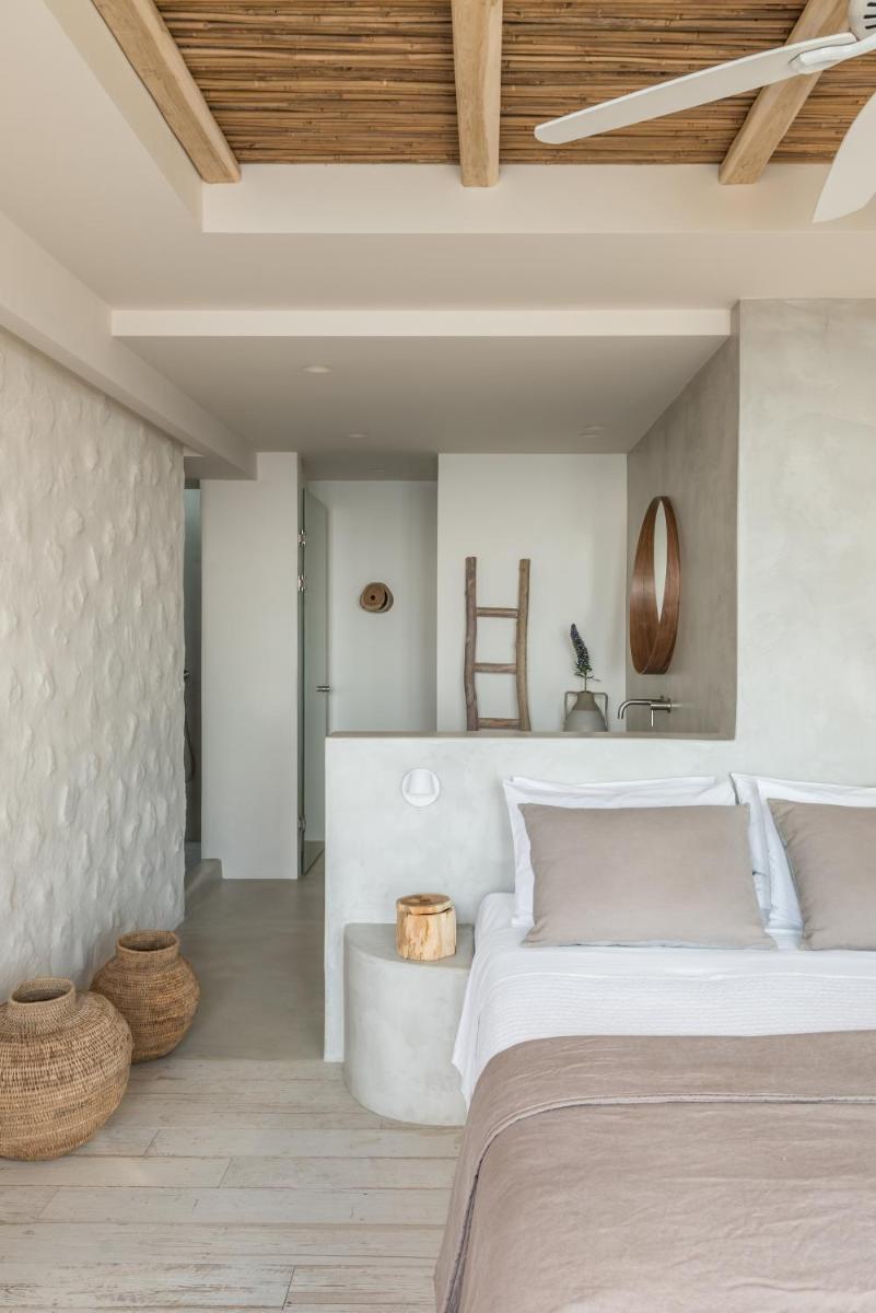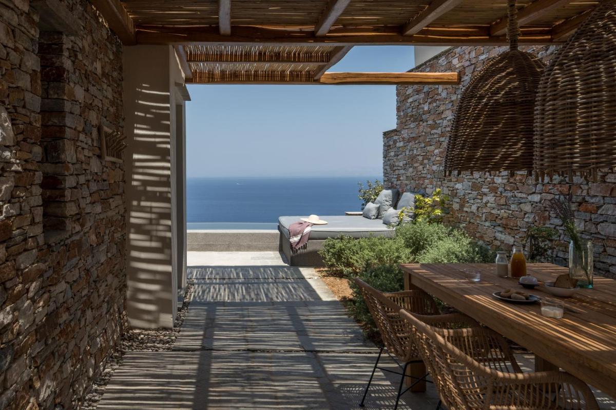 Il design è fedele alla tradizione cicladica, con pareti bianche, pietra locale e arredi eleganti ma essenziali. Le suite e le ville sono progettate per massimizzare la vista, offrendo terrazze private ampie da cui è possibile godere del silenzio e dell'immensità del mare. L'intimità e la privacy sono garantite in ogni alloggio.