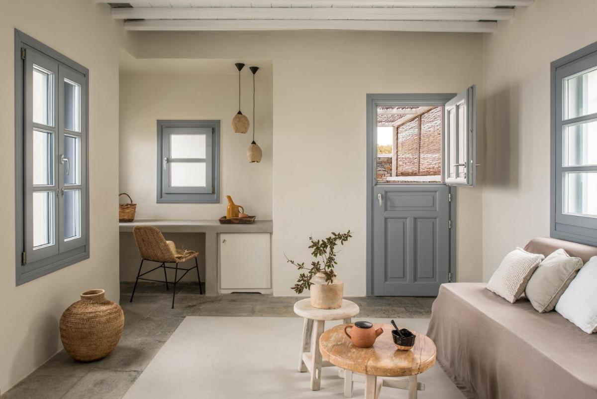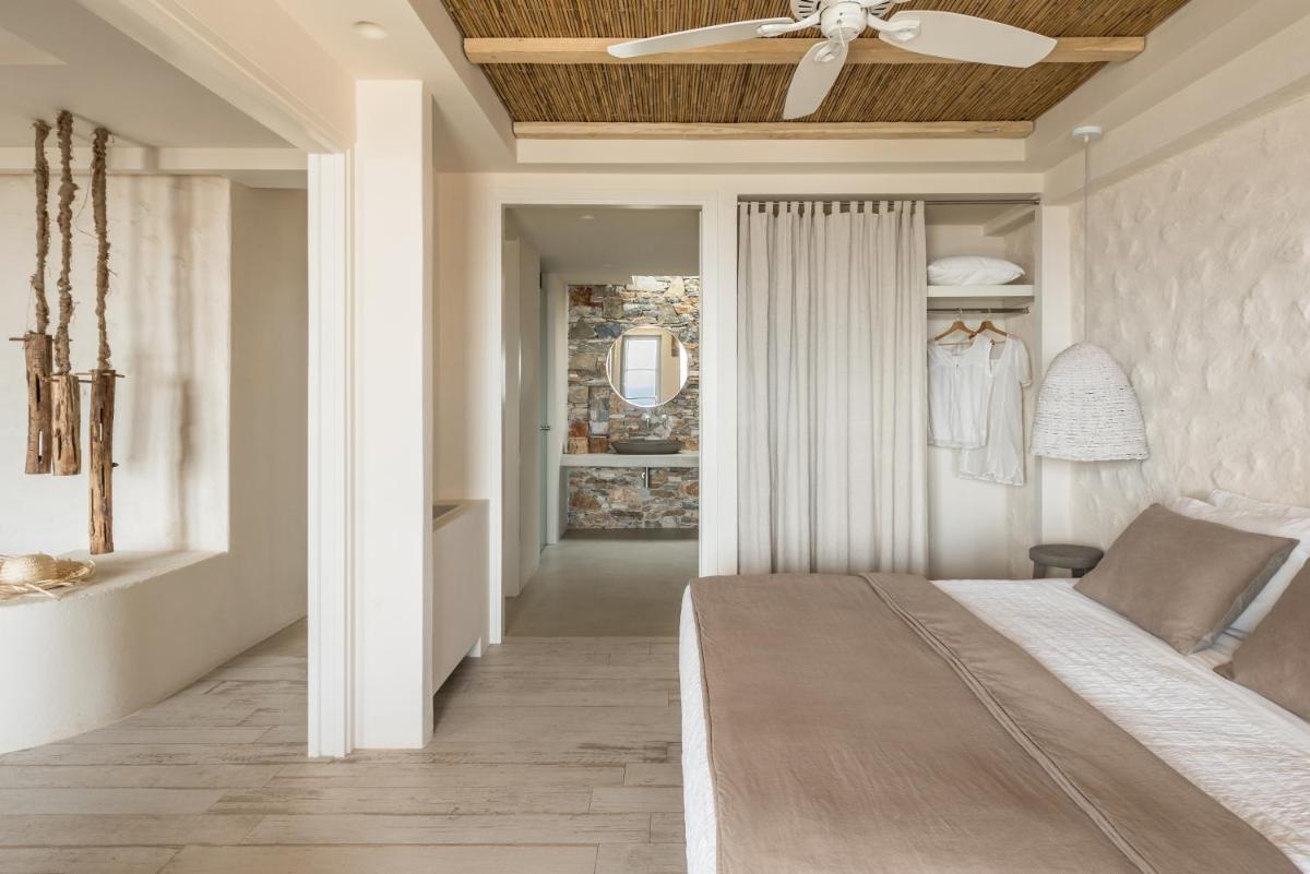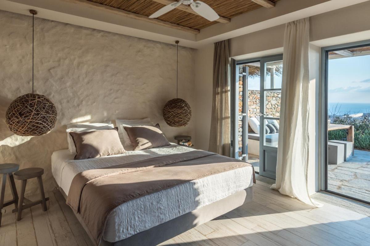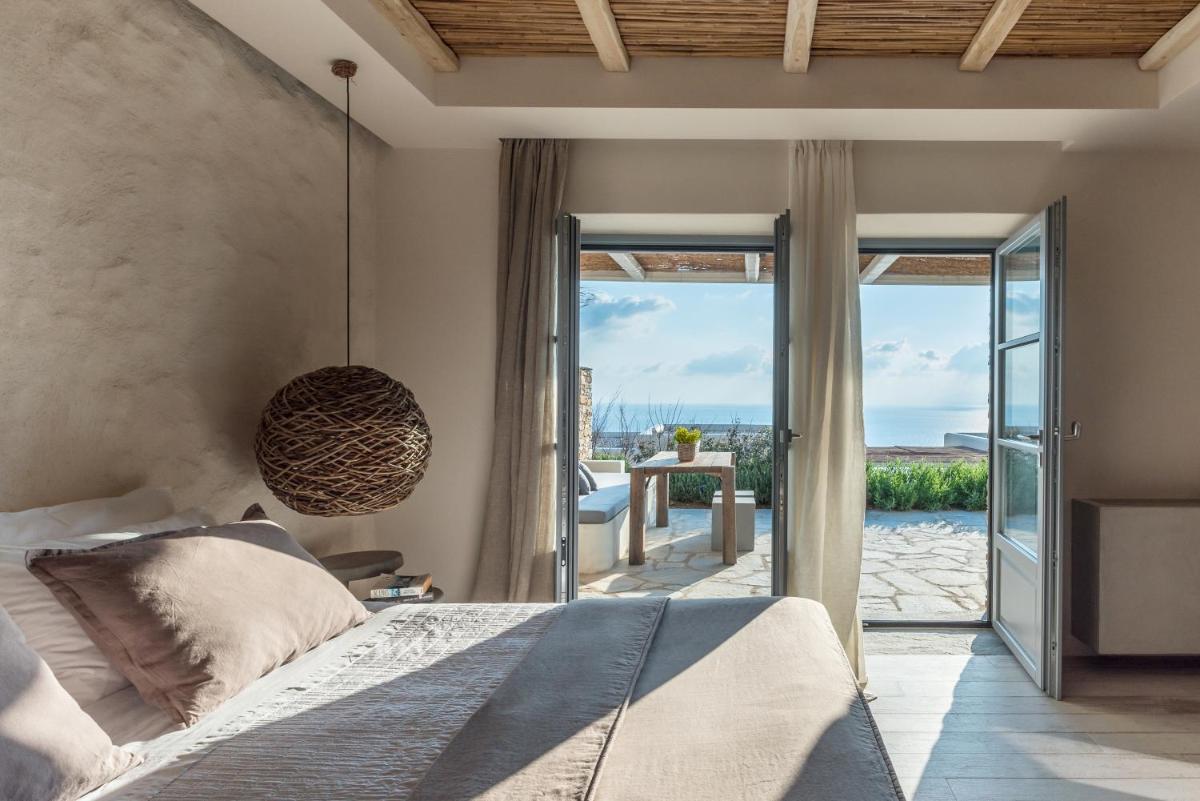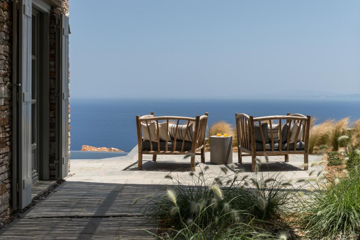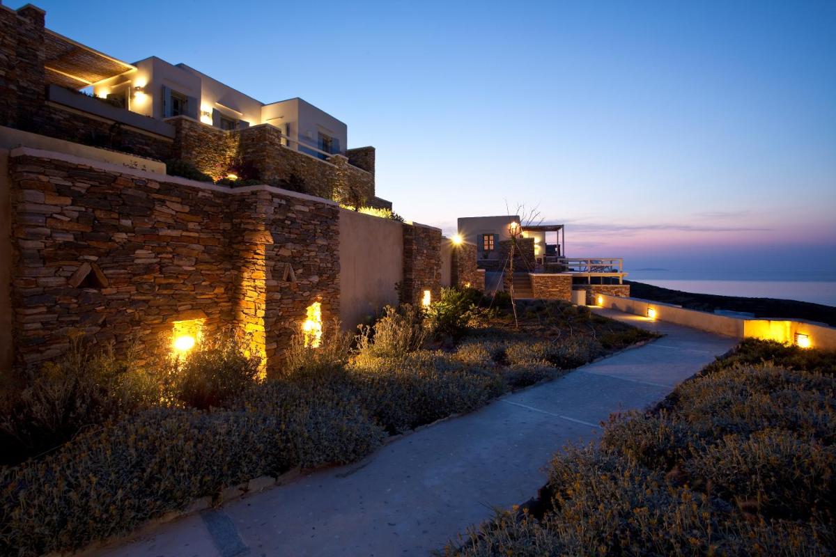 Il design è fedele alla tradizione cicladica, con pareti bianche, pietra locale e arredi eleganti ma essenziali. Le suite e le ville sono progettate per massimizzare la vista, offrendo terrazze private ampie da cui è possibile godere del silenzio e dell'immensità del mare. L'intimità e la privacy sono garantite in ogni alloggio.