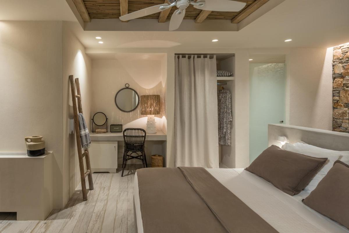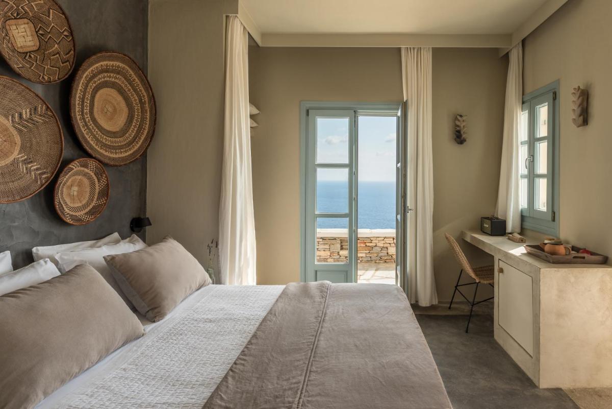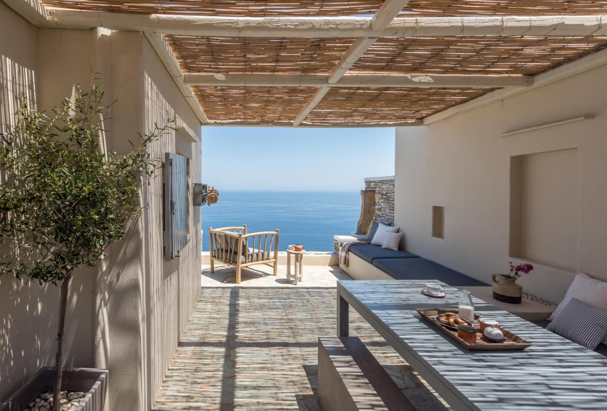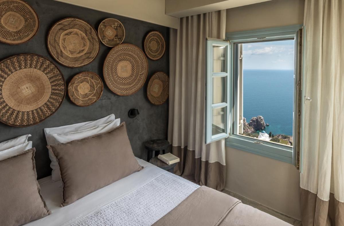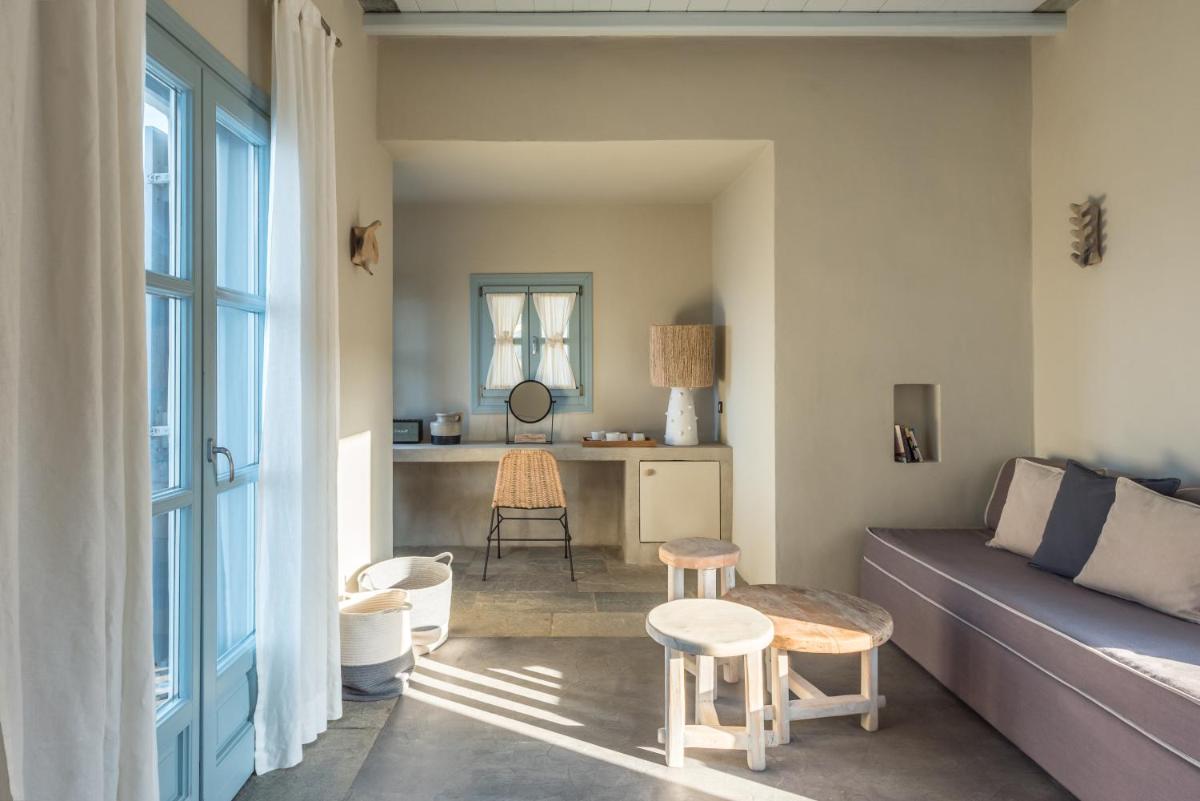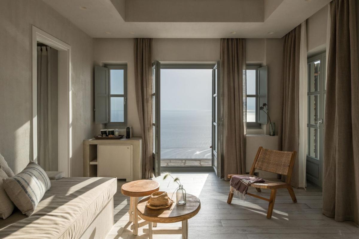 Il design è fedele alla tradizione cicladica, con pareti bianche, pietra locale e arredi eleganti ma essenziali. Le suite e le ville sono progettate per massimizzare la vista, offrendo terrazze private ampie da cui è possibile godere del silenzio e dell'immensità del mare. L'intimità e la privacy sono garantite in ogni alloggio.