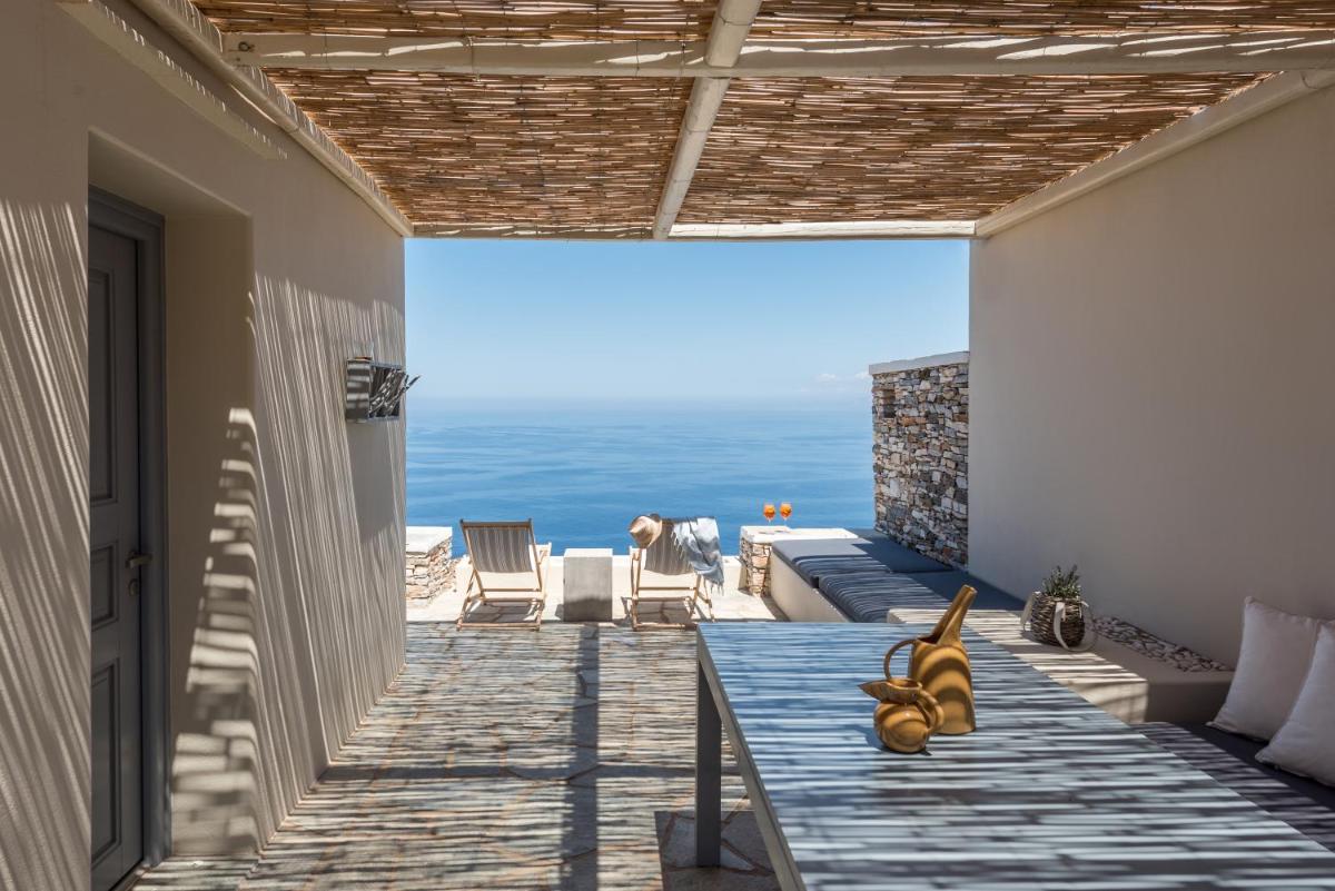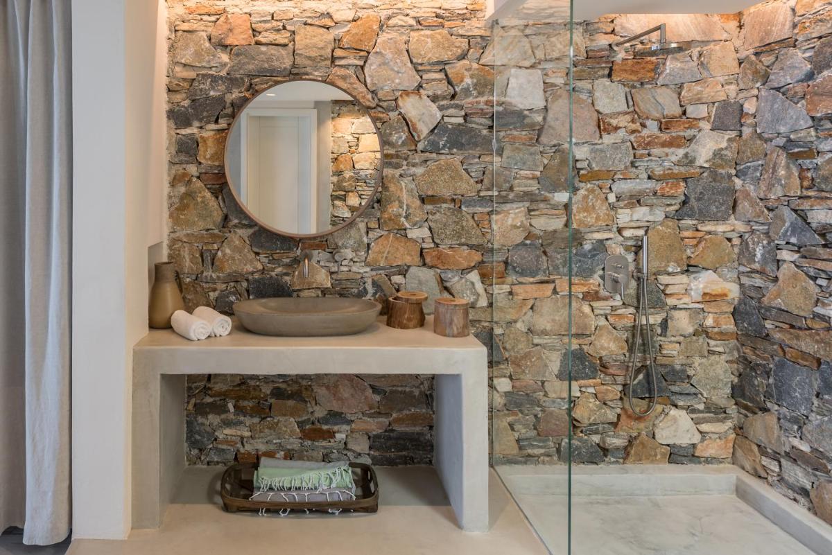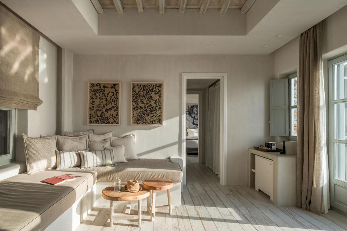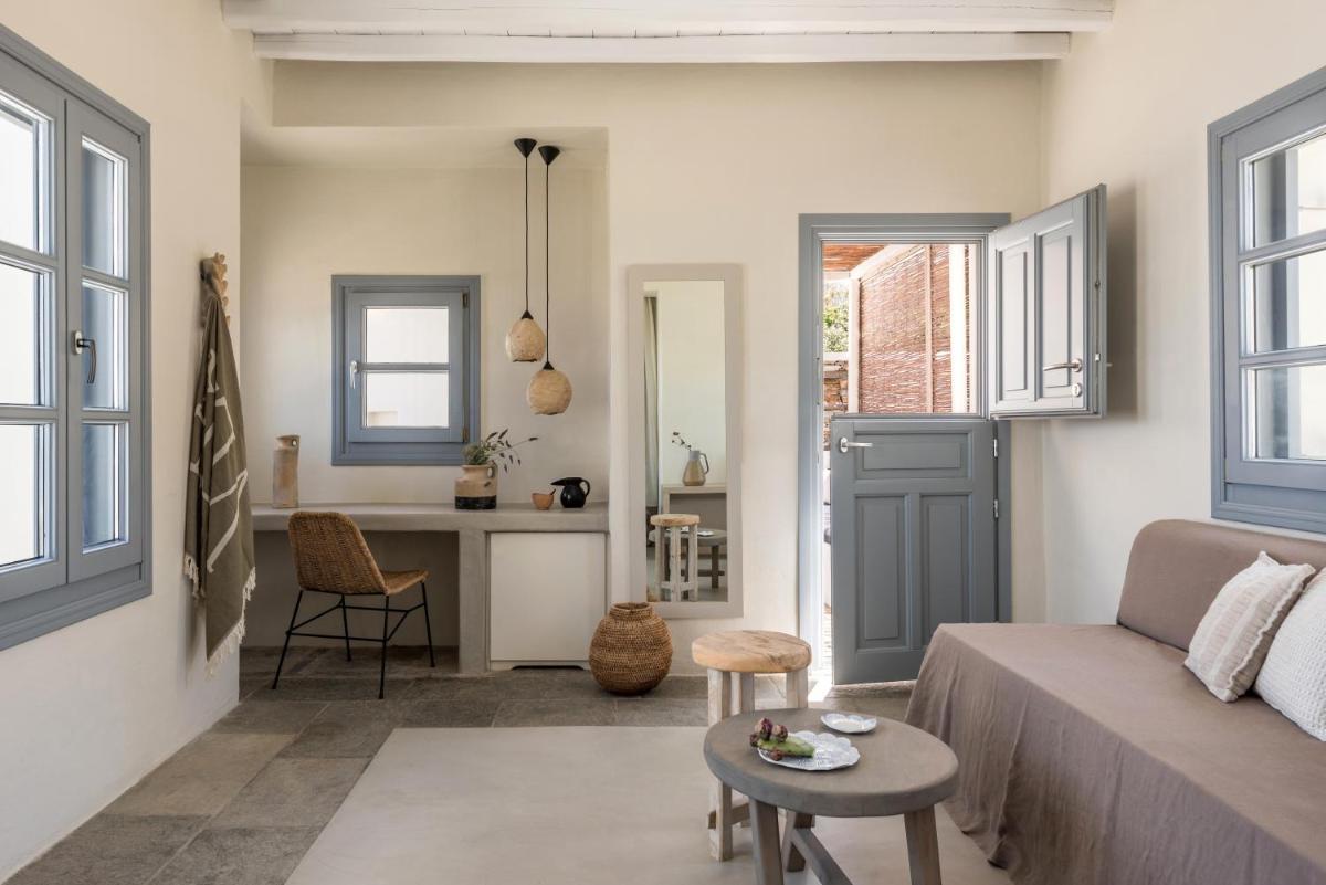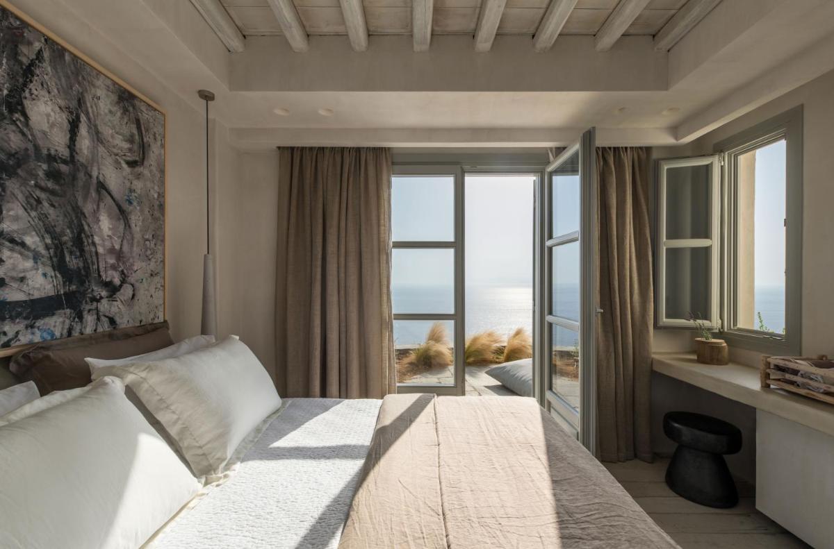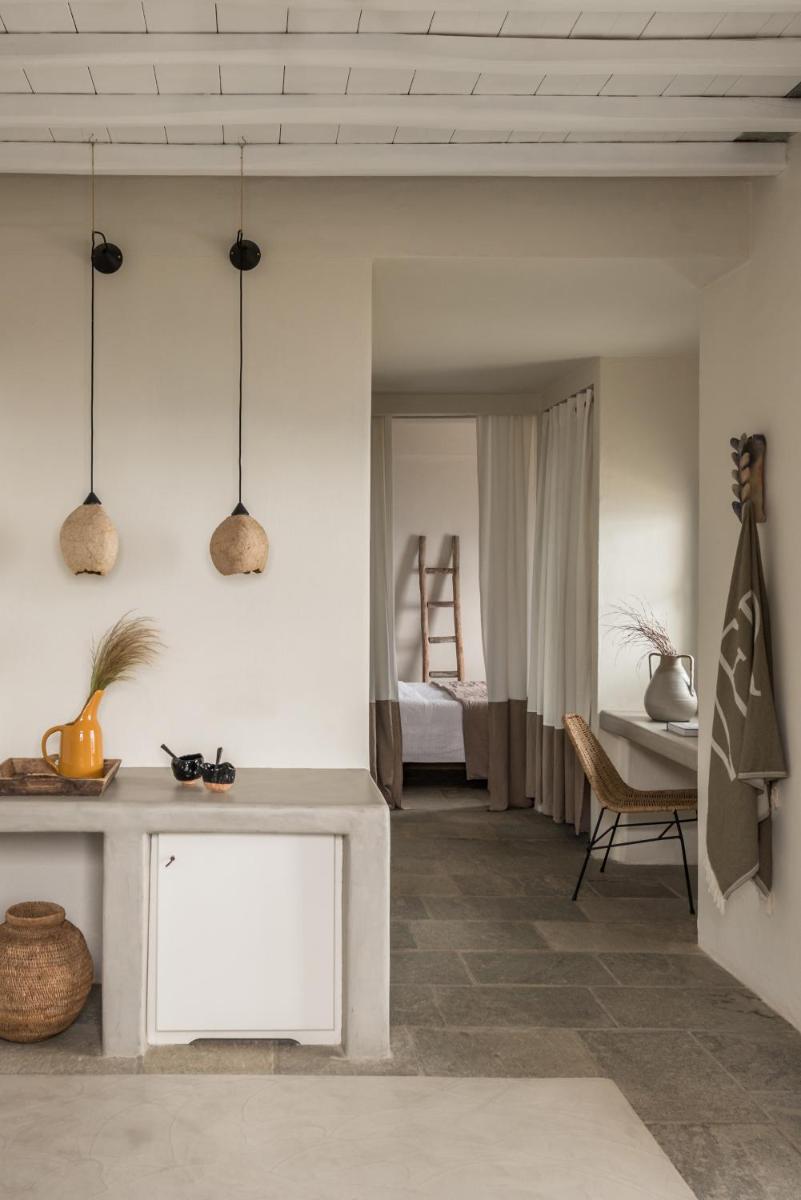 Il design è fedele alla tradizione cicladica, con pareti bianche, pietra locale e arredi eleganti ma essenziali. Le suite e le ville sono progettate per massimizzare la vista, offrendo terrazze private ampie da cui è possibile godere del silenzio e dell'immensità del mare. L'intimità e la privacy sono garantite in ogni alloggio.