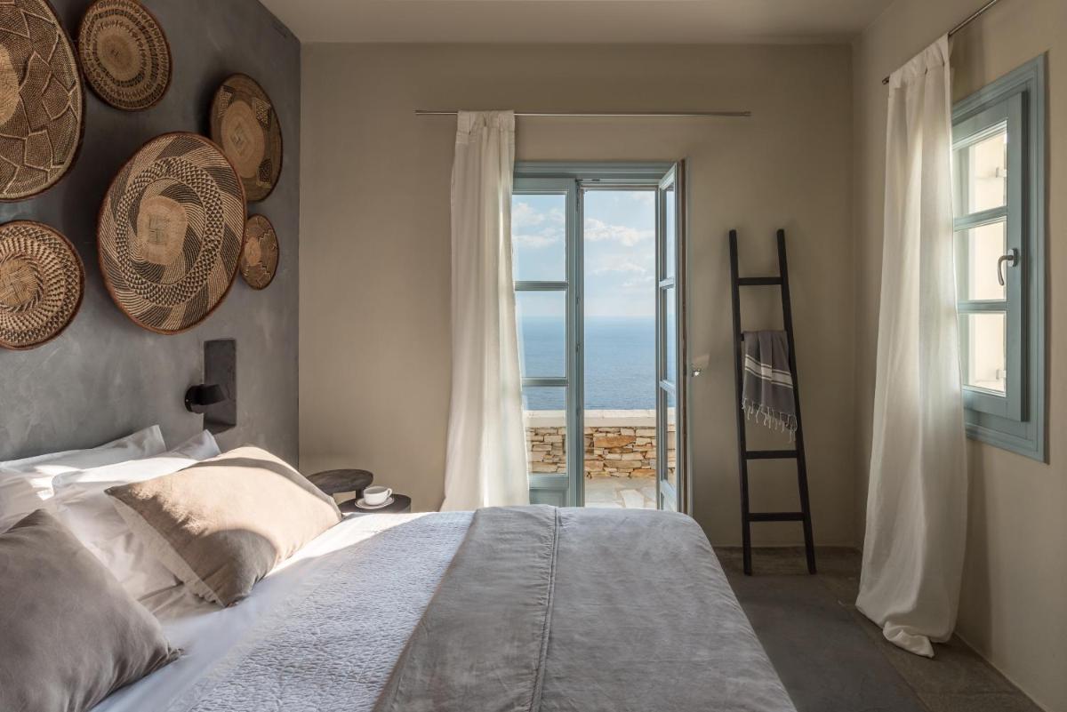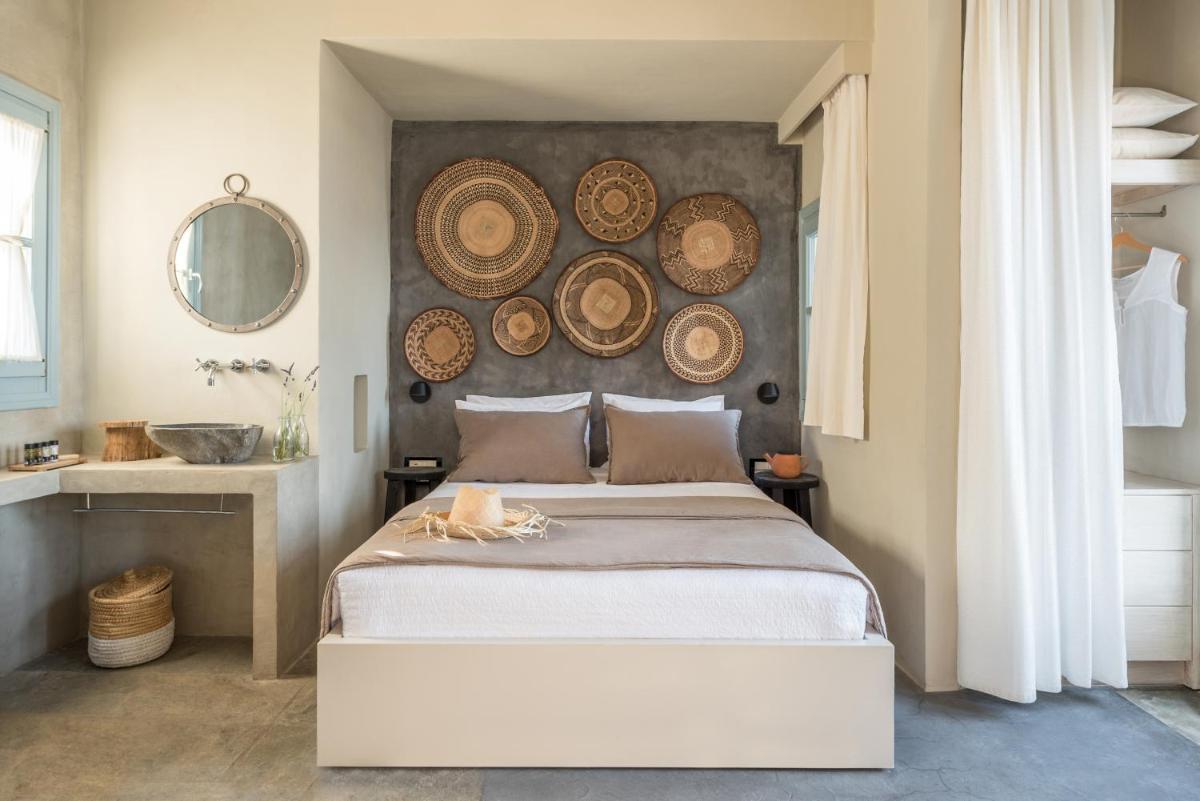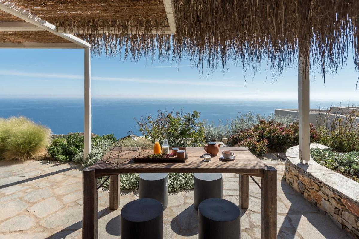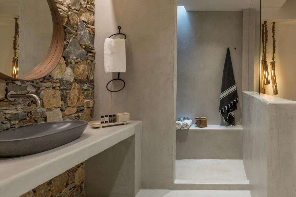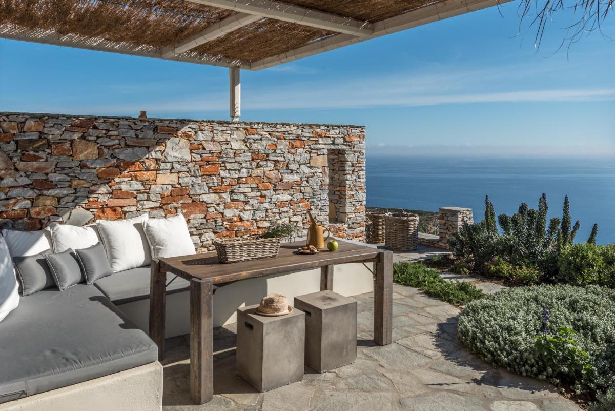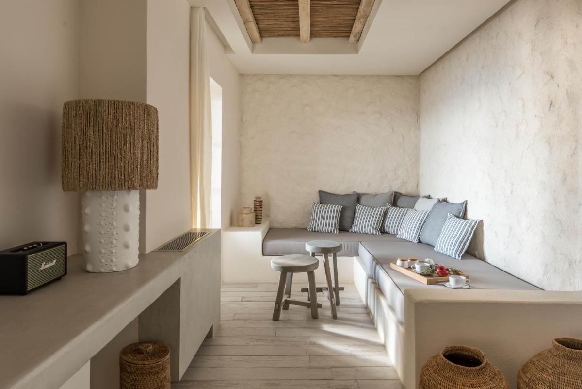 Il design è fedele alla tradizione cicladica, con pareti bianche, pietra locale e arredi eleganti ma essenziali. Le suite e le ville sono progettate per massimizzare la vista, offrendo terrazze private ampie da cui è possibile godere del silenzio e dell'immensità del mare. L'intimità e la privacy sono garantite in ogni alloggio.