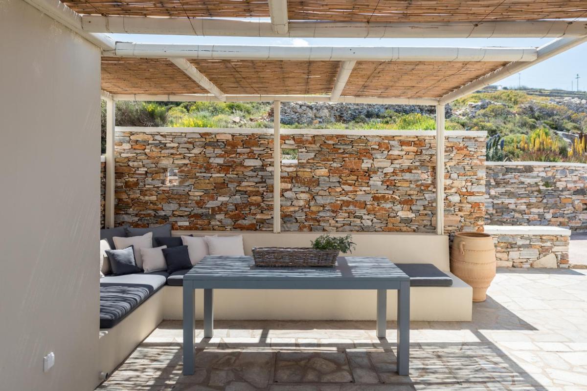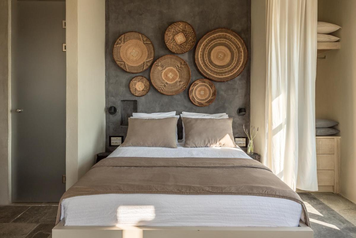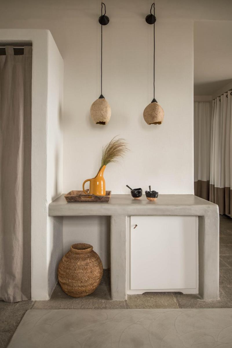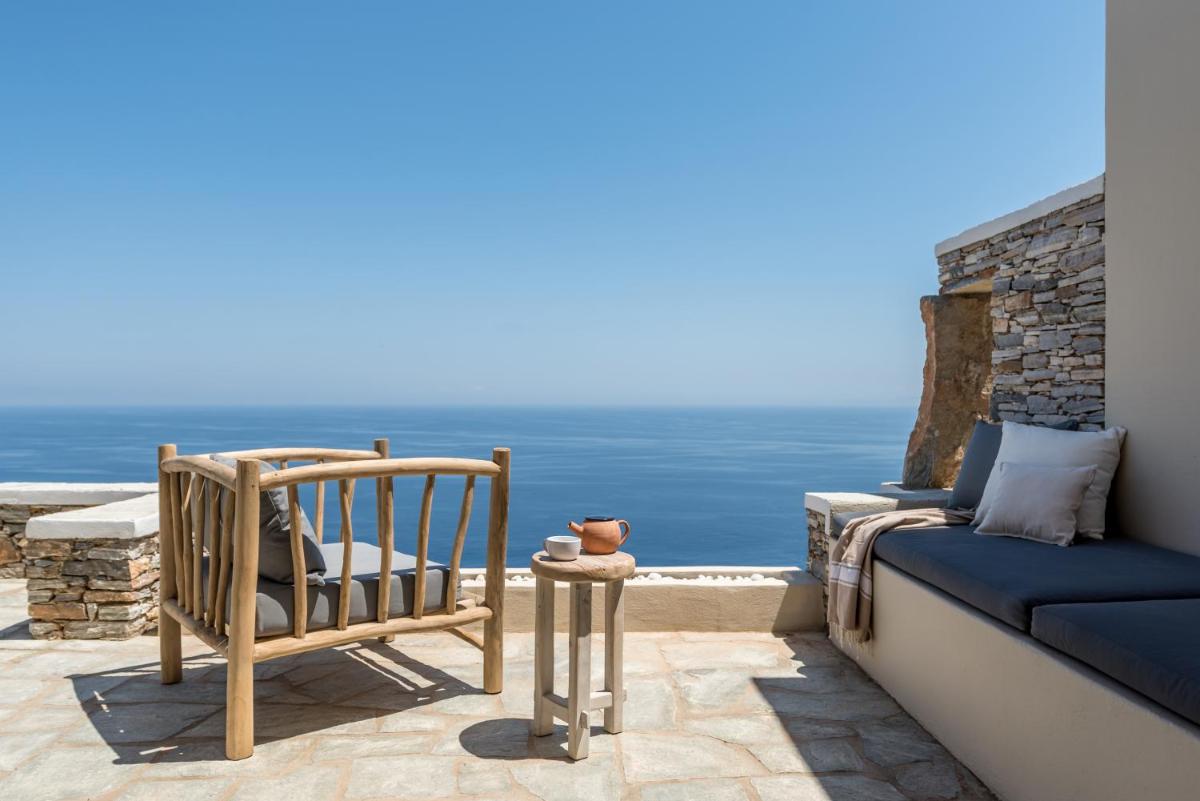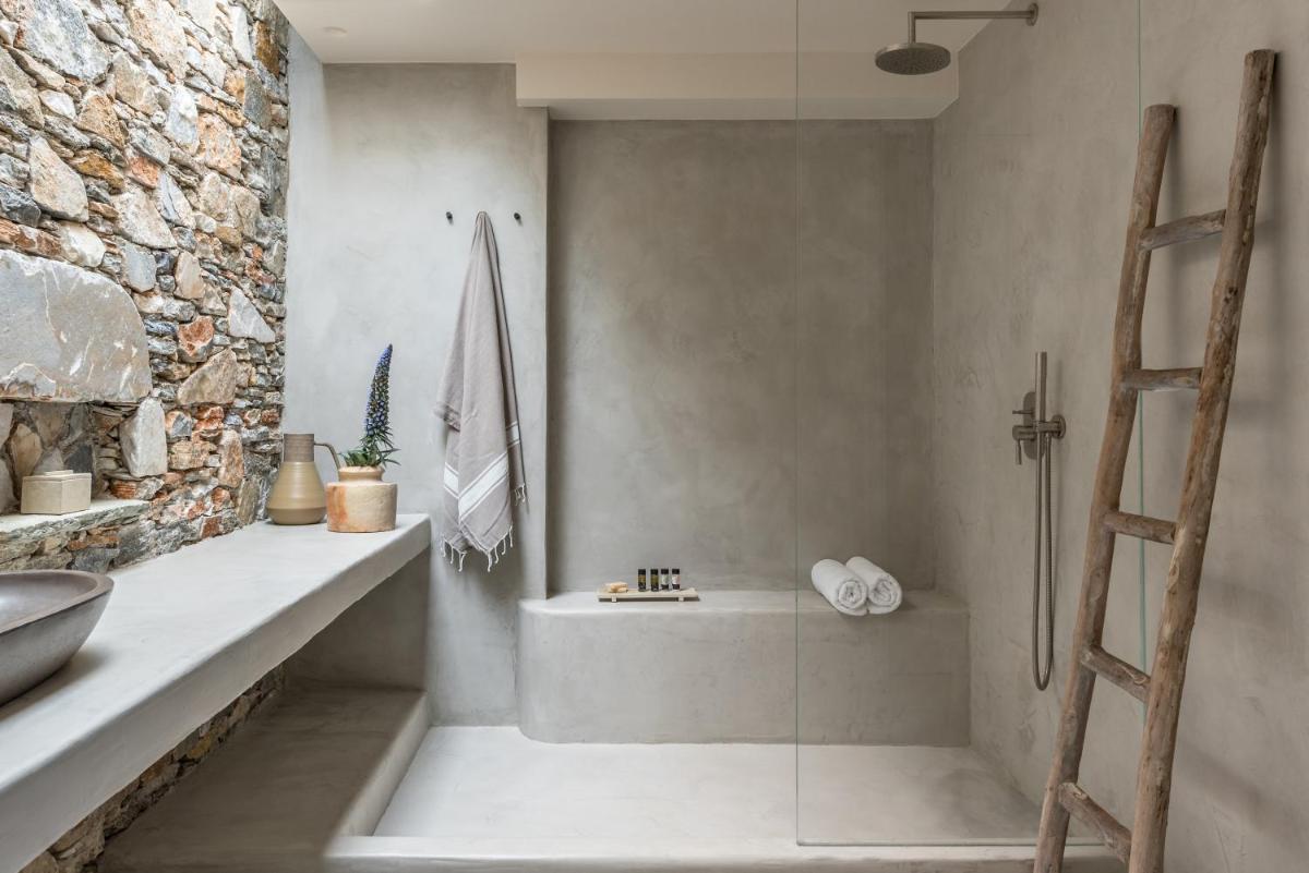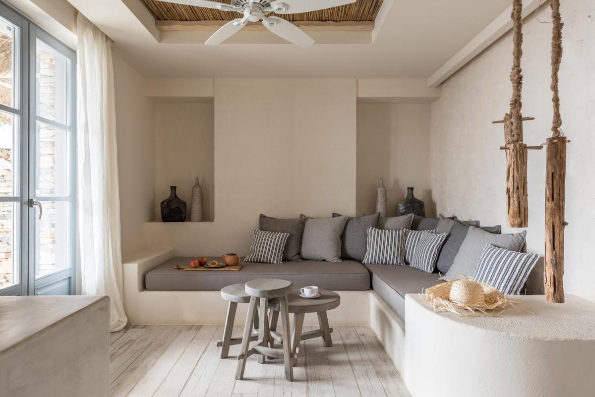 Il design è fedele alla tradizione cicladica, con pareti bianche, pietra locale e arredi eleganti ma essenziali. Le suite e le ville sono progettate per massimizzare la vista, offrendo terrazze private ampie da cui è possibile godere del silenzio e dell'immensità del mare. L'intimità e la privacy sono garantite in ogni alloggio.