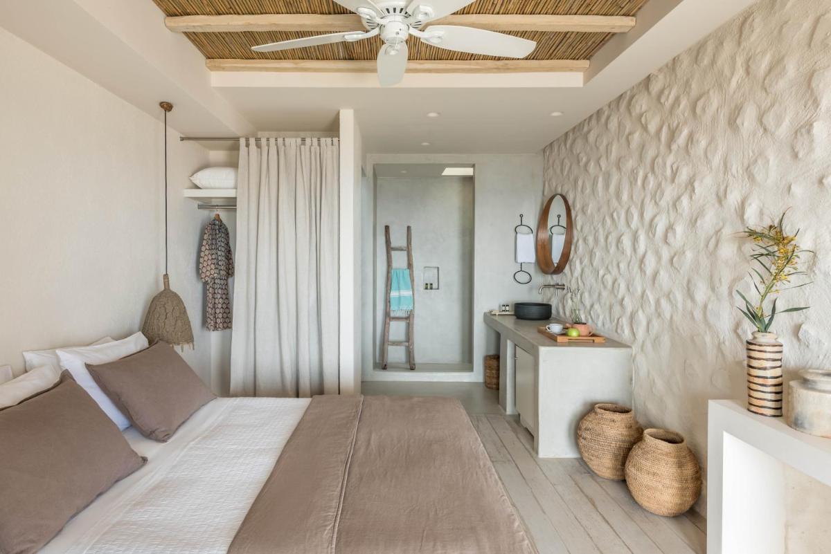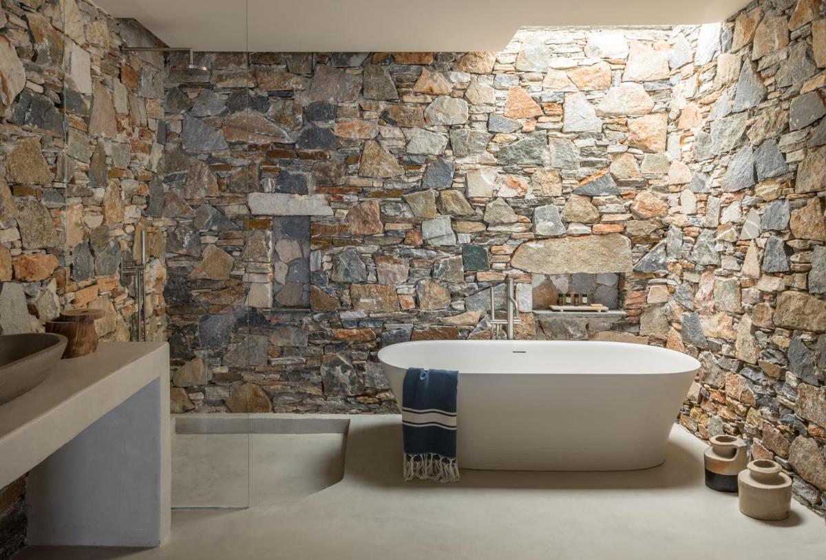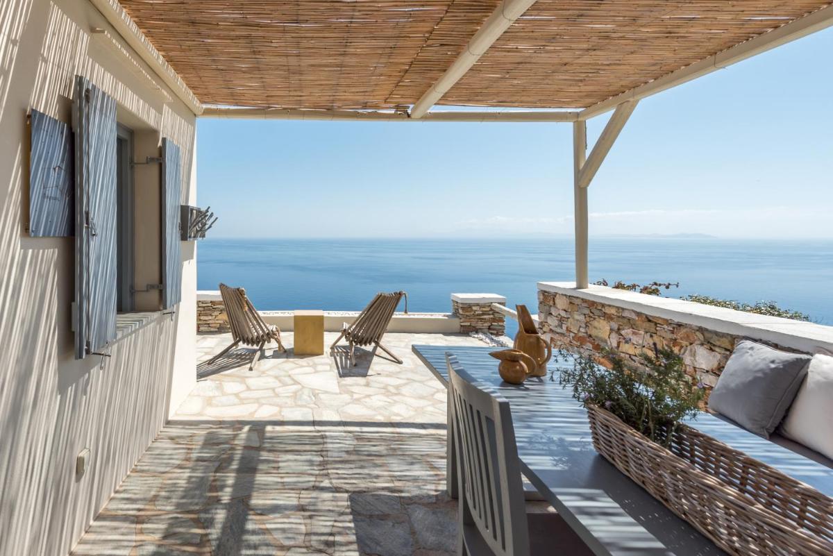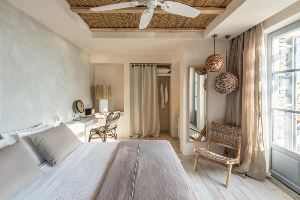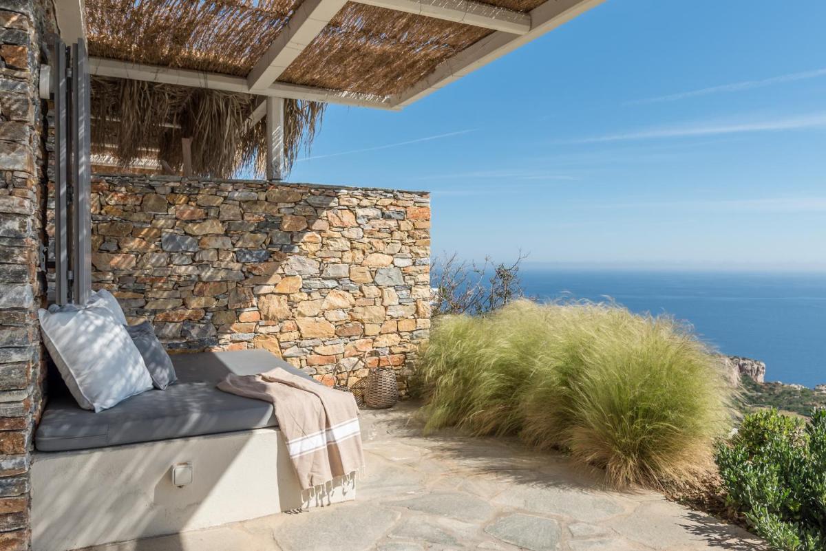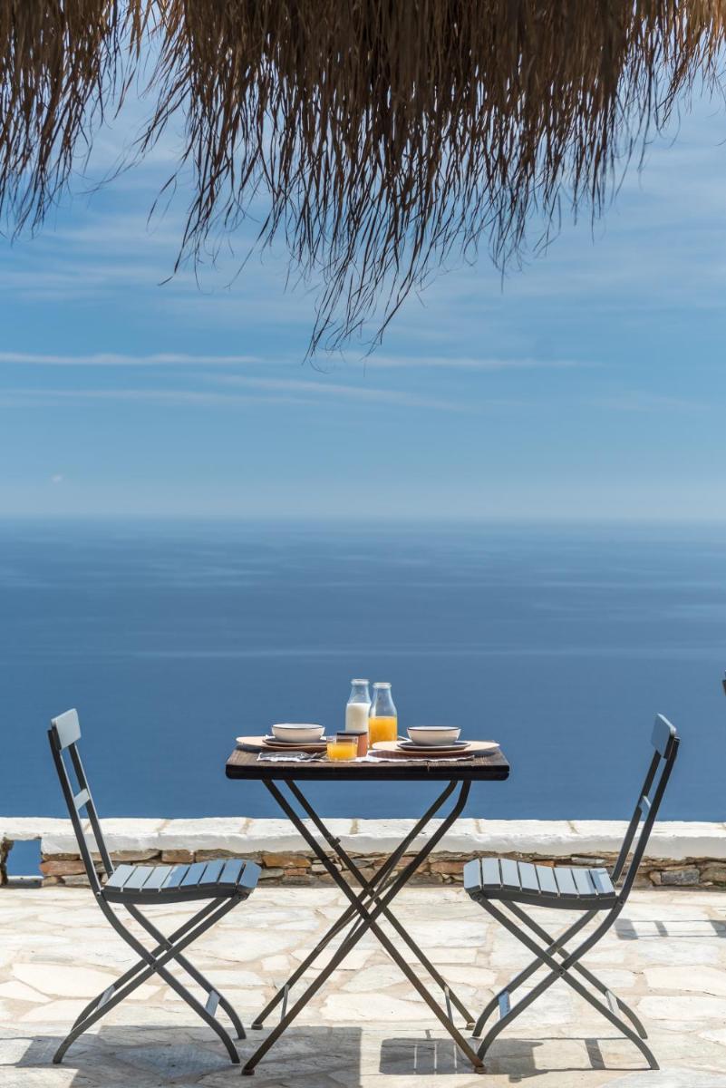 Il design è fedele alla tradizione cicladica, con pareti bianche, pietra locale e arredi eleganti ma essenziali. Le suite e le ville sono progettate per massimizzare la vista, offrendo terrazze private ampie da cui è possibile godere del silenzio e dell'immensità del mare. L'intimità e la privacy sono garantite in ogni alloggio.