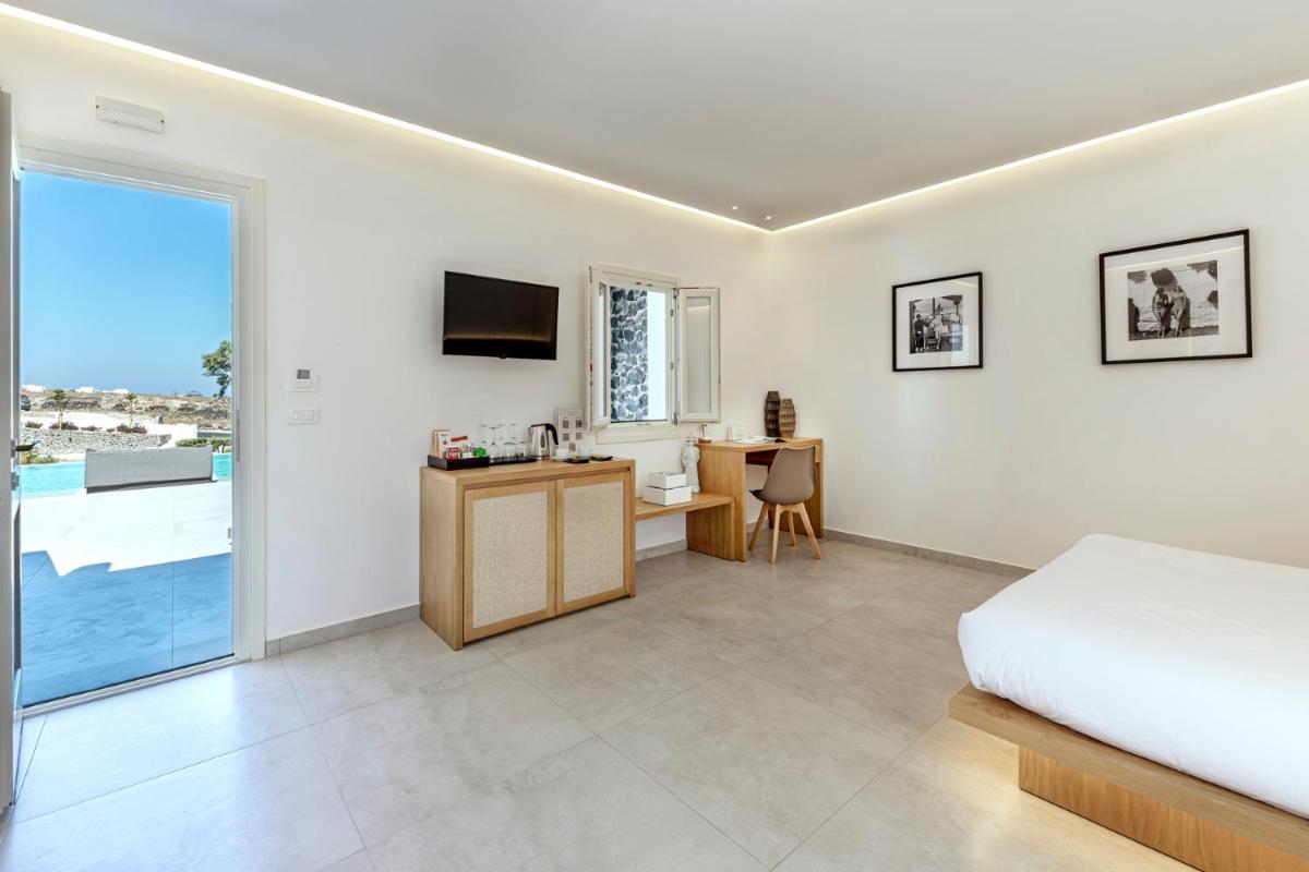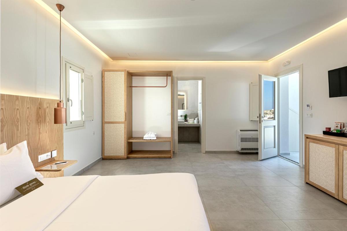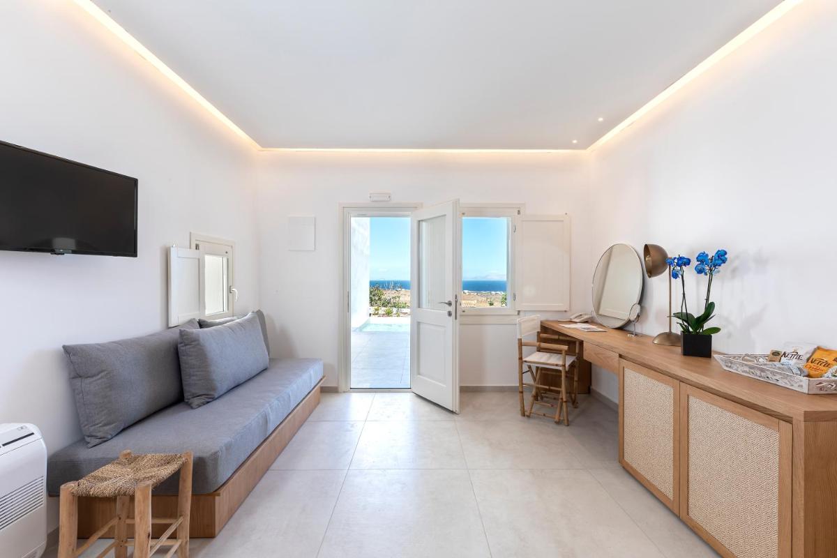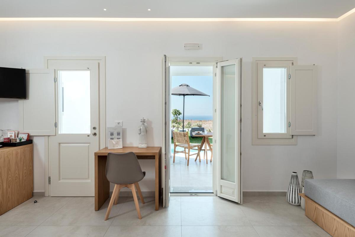 Le sistemazioni del Secret View sono caratterizzate da un design moderno che fonde l'estetica minimalista con l'architettura cicladica. I colori neutri, i materiali naturali e le linee pulite creano un ambiente rilassante e sofisticato. Molte camere e suite vantano Jacuzzi o piscine private esterne, ideali per godersi il sole e la vista in totale riservatezza, un lusso che definisce l'esperienza.