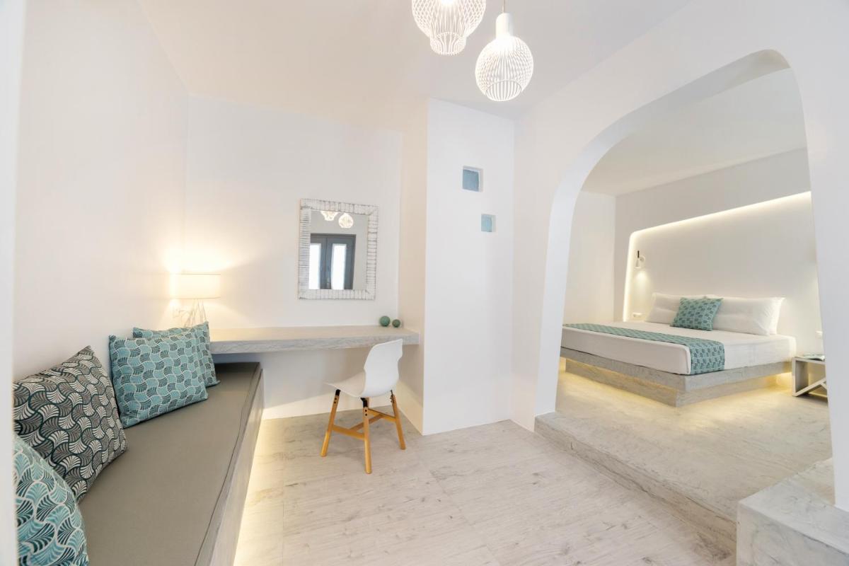Ogni sistemazione presso la Villa è un pezzo unico, arredata con una palette di colori rilassanti e materiali di alta qualità. Dalle camere 'Superior' alle suite più spaziose, gli ospiti possono godere di un comfort moderno in un'atmosfera che celebra la luce naturale delle Cicladi. Molte unità vantano balconi o verande private che si affacciano sulla corte interna o sui vicoli fioriti circostanti.