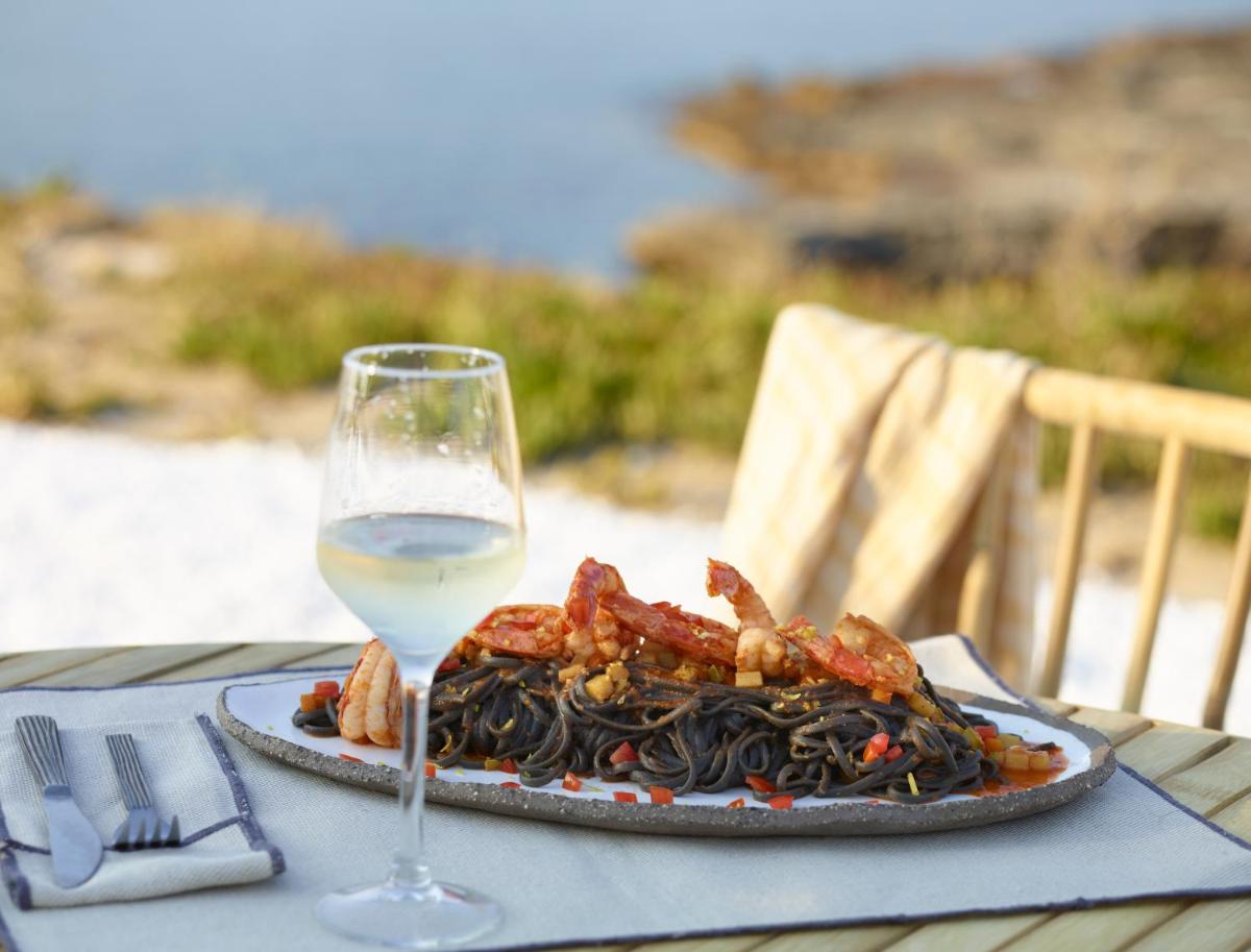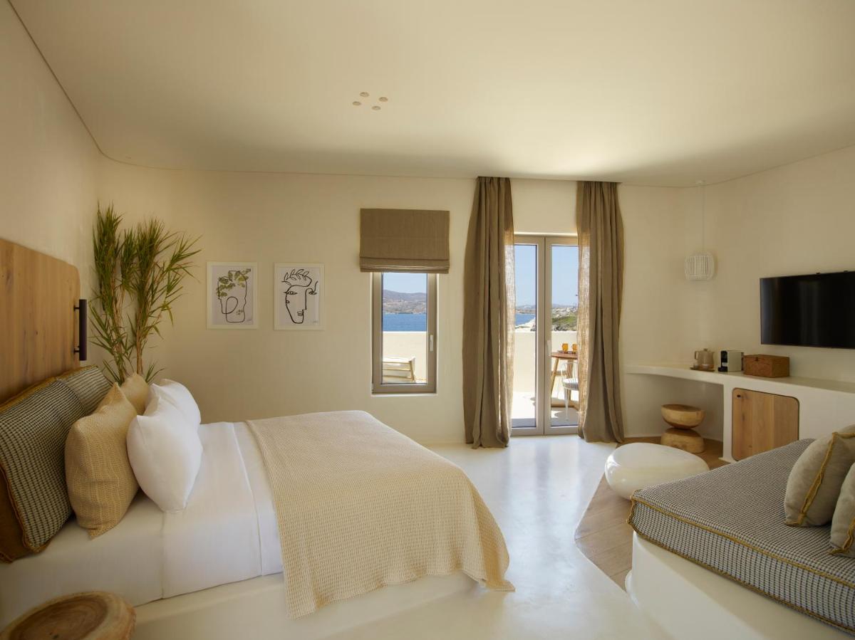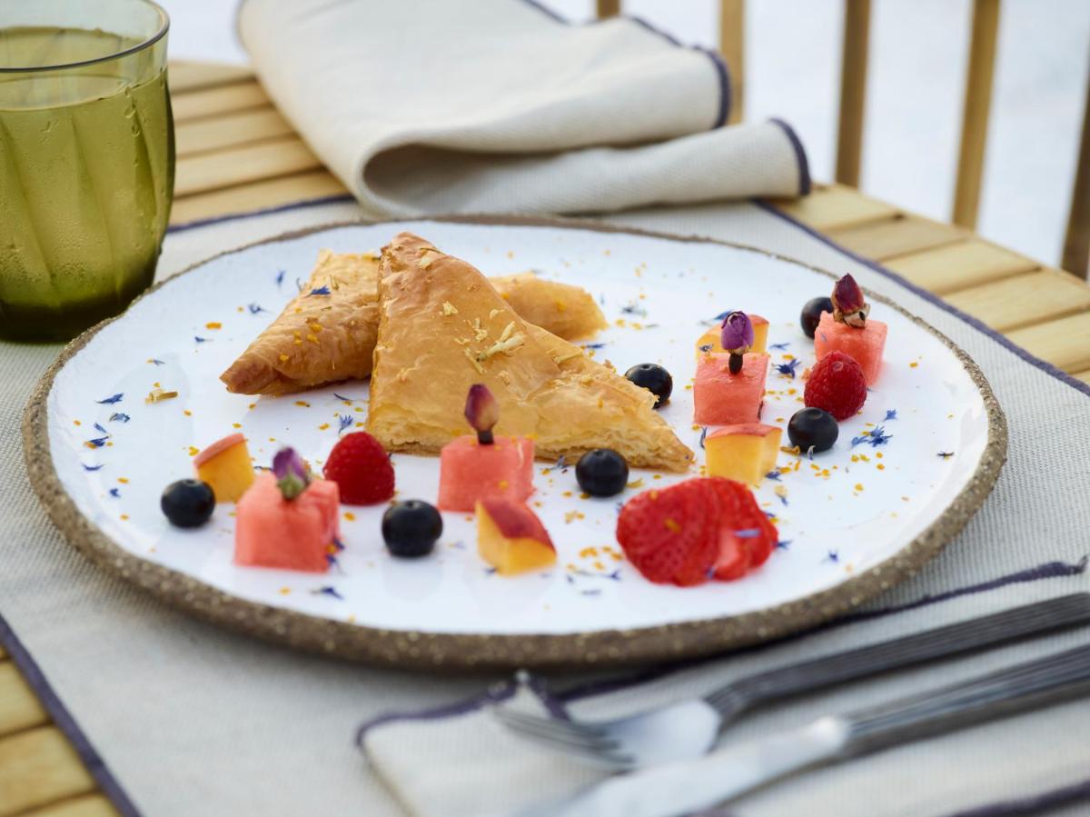 La giornata inizia con una ricca colazione à la carte, che celebra i sapori locali e le specialità greche fresche. L'attenzione alla qualità e alla provenienza degli ingredienti rende questo pasto un'autentica esperienza culinaria. Il bar adiacente offre cocktail e bevande rinfrescanti da gustare ammirando il paesaggio cicladico.
